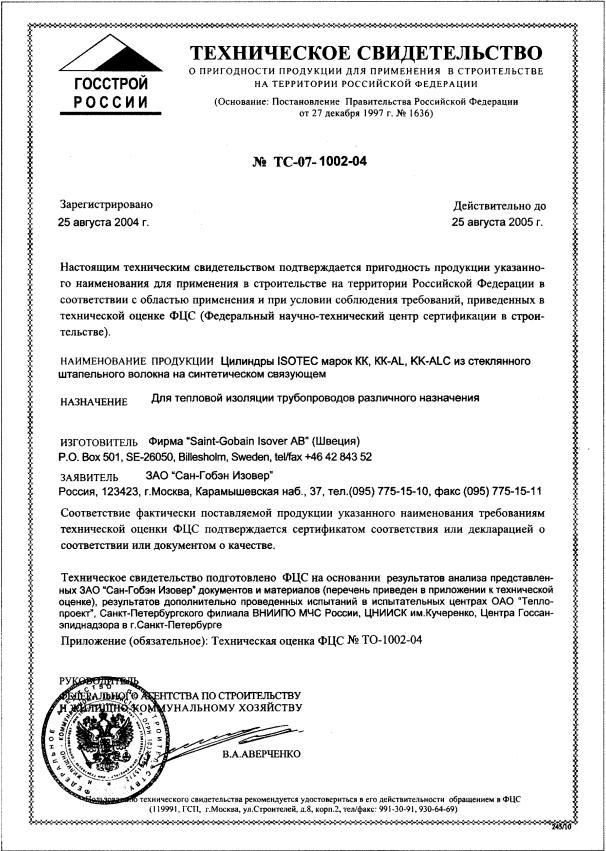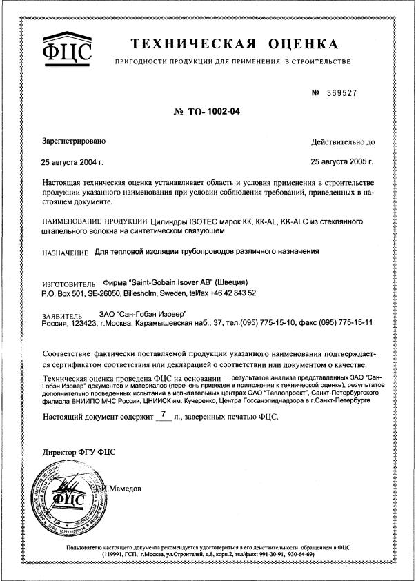 ТЕХНИЧЕСКАЯ ОЦЕНКА ПРИГОДНОСТИ ПРОДУКЦИИ ДЛЯ ПРИМЕНЕНИЯ В СТРОИТЕЛЬСТВЕ № ТО-1002-04 Продукция: Цилиндры ISOTEC марок КК, KK-AL, KK-ALC из стеклянного штапельного волокна на синтетическом связующем Изготовитель: Фирма «Saint-Gobain Isover AB» (Швеция) Назначение: Для тепловой изоляции трубопроводов различного назначения Настоящий документ является приложением к техническому свидетельству Госстроя России № ТС-07-1002-04; содержит 7 л., заверенных печатью ФЦС 1. ОБЩИЕ ПОЛОЖЕНИЯ 1.1. Настоящий документ содержит требования к продукции - цилиндры ISOTEC марок КК, KK-AL, KK-ALC из стеклянного штапельного волокна на синтетическом связующем (далее - цилиндры), предназначенные для тепловой изоляции трубопроводов различного назначения. Документ предназначен для использования при разработке в установленном порядке технической документации на продукцию и проектной документации на строительство объектов с её применением. При проектировании и строительстве объектов с использованием указанной продукции должны соблюдаться обязательные требования строительных, санитарных, пожарных, промышленных, экологических, а также других норм безопасности, утвержденных в соответствии с действующим порядком. 1.2. Настоящий документ составлен на основании результатов анализа представленных заявителем документов и материалов (перечень приведен в приложении к технической оценке), результатов дополнительно проведенных испытаний в испытательных центрах ОАО «Теплопроект», Санкт-Петербургского филиала ВНИИПО МЧС России, ЦНИИСК им. Кучеренко, Центра Госсанэпиднадзора в г. Санкт-Петербурге. Документ не устанавливает юридические права заявителя на технические и технологические решения, примененные в продукции. Заявитель несет ответственность за недостоверность и неполноту (сокрытие) информации в представленных им документах и материалах на продукцию, что может привести к снижению уровня безопасности и надежности продукции и объектов с её применением. 1.3. Техническая документация на цилиндры представлена ЗАО «Сан-Гобэн Изовер» (Россия). 1.4. Цилиндры изготавливаются фирмой «Saint-Gobain Isover AB» (Швеция). 1.5. Цилиндры необходимо изготавливать только с применением материалов, указанных в настоящем документе. 1.6. ФЦС при получении новой информации о технических, эксплуатационных и иных свойствах цилиндров: - вносит изменения и дополнения в положения, содержащиеся в настоящем документе, или отменяет их; - производит проверку соблюдения фирмой «Saint-Gobain Isover AB» требований настоящего документа; - при несоблюдении требований настоящего документа, в зависимости от характера допущенных нарушений, подготавливает представление о приостановлении действия или об отзыве технического свидетельства Госстроя России на цилиндры. 2. ПРИНЦИПИАЛЬНОЕ ОПИСАНИЕ ПРОДУКЦИИ 2.1. Цилиндры представляют собой полые изделия из стеклянных штапельных волокон, скрепленных между собой отвержденным синтетическим связующим. 2.2. Цилиндры изготавливают методом навивки и последующей термообработки. 2.3. Для изготовления волокон с температурой плавления не ниже 600 °С применяется силикатное стекло состава, разработанного фирмой «Saint-Gobain Isover АВ» (состав стекла представлен в ФЦС). 2.4. В качестве связующего при производстве цилиндров применяются композиции, состоящие из водорастворимых синтетических смол, гидрофобизирующ