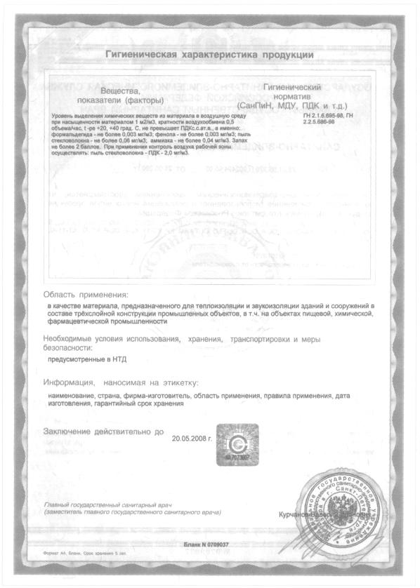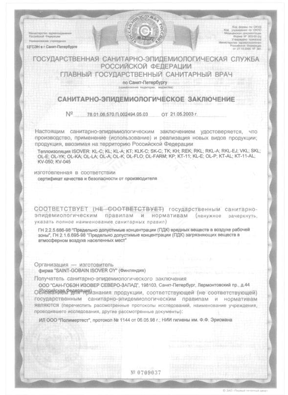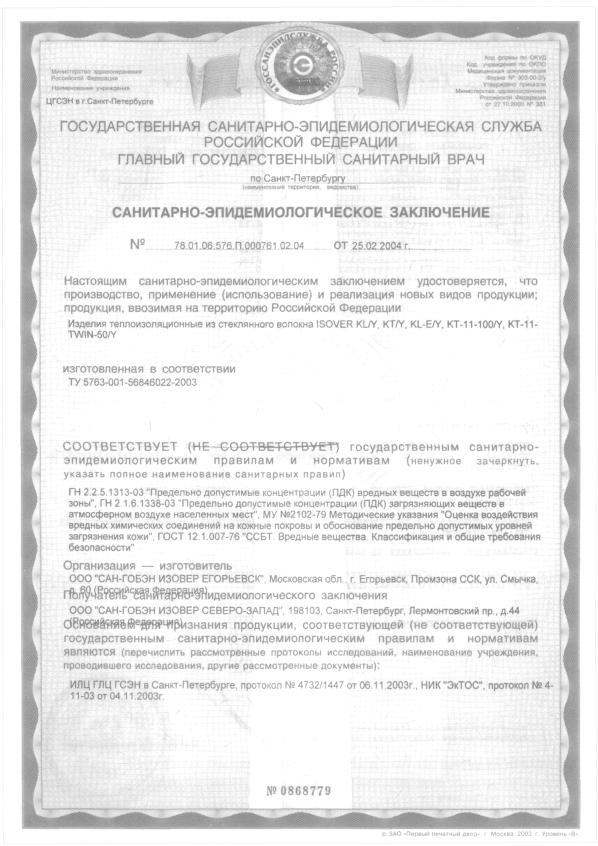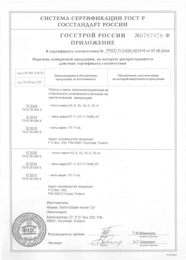 1) - справочное значение 4.4. Плиты и маты должны иметь однородную структуру без пустот, разрывов и расслоений, не содержать посторонних включений. 4.5. Материалы, применяемые для каширования при изготовлении плит марки KL-C и матов марки KT-11-AL, должны быть приклеены к поверхности изделия по всей площади без отслоений, надрывов и проколов. 4.6. Упаковка и маркировка 4.6.1. Плиты собирают в технологические пакеты, подпрессовывают до 25 % от исходной толщины и упаковывают в полиэтиленовую пленку. 4.6.2. Технологические пакеты далее укладывают на палеты, которые также могут быть упакованы в полиэтиленовую пленку с нанесенным на нее логотипом изготовителя. 4.6.3. Плиты могут также поставляться в крупноразмерных упаковках MULTI-PACK на поддонах. 4.6.4. Маты в рулонированном виде упаковывают в мешки из термоусадочной полиэтиленовой пленки. При упаковке маты подпрессовываются до 25 % от исходной толщины. 4.6.5. На каждый технологический или транспортный пакет наносят маркировку, содержащую следующую информацию: - марка продукции; - количество продукции в упаковке (м2, м3); - номинальные геометрические размеры изделия; - дата изготовления; - изображение знака пригодности с обозначением настоящего технического свидетельства; - другая информация по усмотрению изготовителя. 5. БЕЗОПАСНОСТЬ И НАДЕЖНОСТЬ ПРИМЕНЕНИЯ ПРОДУКЦИИ Условия безопасности и надежности применения продукции должны устанавливаться в проекте на строительство конкретного объекта с ее применением с учетом требований настоящей технической оценки. При этом: 5.1. Соответствие характеристик плит и матов требованиям нормативных документов, а также назначению и допускаемой области применения, указанным в разделе 3 настоящего документа, установлено на основе анализа представленных заявителем документов и материалов [6.1 - 6.7] и экспертизы результатов: - санитарно-химических испытаний плит и матов [6.8]; - пожарно-технических испытаний плит и матов [6.9]; - теплофизических испытаний плит и матов [6.10]; - акустических испытаний плит [6.11]. 5.2. Плиты и маты должны применяться в соответствии с проектной документацией на строительство, требованиями СНиП 23-02-2003, а также назначением и допускаемой областью применения, указанным в разделе 3 настоящего документа. 5.3. При применении плит и матов должны выполняться правила охраны труда и техники безопасности, установленные СНиП 12-03-2001, СНиП 12-04-2002 и другими нормативными документами. 5.4. При применении плит в фасадных системах с воздушным зазором их поверхность должны быть защищена снаружи плитами из минеральной ваты с температурой плавления волокон не ниже 1000 °С. Обрамления оконных и дверных проемов должно осуществляться полосами из минераловатных плит на всю толщину теплоизоляционного слоя. 6. ПЕРЕЧЕНЬ ИСПОЛЬЗОВАННЫХ ДОКУМЕНТОВ И МАТЕРИАЛОВ 6.1. Техническое свидетельство Госстроя России № ТС-07-0666-03 от 13.02.03. 6.2. Каталог по строительной изоляции ISOVER. Фирма «Saint-Gobain Isover Оу» (Финляндия), ЗАО «Сан-Гобэн Изовер». 6.3. Спецификации продуктов KL-E, KL, KL-C, KL-A,KT-11, КТ-11-TWIN, КТ, КТ-11-AL. ЗАО «Сан-Гобэн Изовер». 6.4. СНиП 23-02-2003 «Тепловая защита зданий». 6.5. СНиП II-12-77 «Защита от шума». 6.6. ГОСТ 23499-79 «Материалы и изделия строительные звукопоглощающие и звукоизоляционные. Классификация и общие требования». 6.7. Сертификат соответствия № 125539 от 19.02.03 на систему менеджмента качества по ISO 9001:2000. Фирма «Saint-Gob