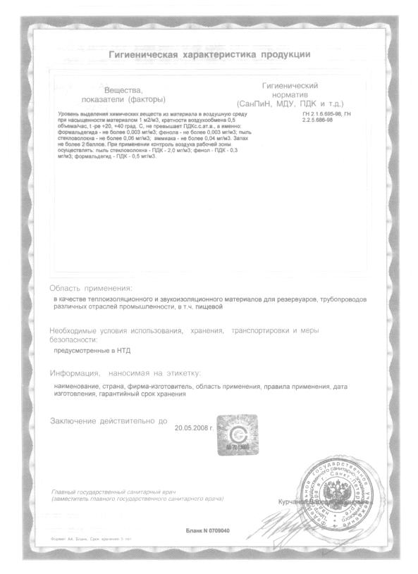 4.4. Цилиндры должны иметь однородную структуру без пустот, расслоений и разрывов, не содержать посторонних включений. 4.5. Алюминиевая фольга, используемая для облицовки цилиндров KK-AL и KK-ALC, должна быть приклеена к поверхности по всей площади без складок, надрывов и отслоений. 4.6. Упаковка и маркировка 4.6.1. Цилиндры укладывают в картонные короба, которые далее заклеивают по линии разъема. 4.6.2. Цилиндры малых диаметров могут упаковываться по нескольку штук в термоусадочную пленку. 4.6.3. Упакованные по п.п. 4.6.1. и 4.6.2. цилиндры укладывают на поддоны, которые могут дополнительно оборачиваться самостягивающейся пленкой. 4.6.4. Каждое упакованное место снабжается этикеткой, содержащей следующие сведения: - наименование предприятия-изготовителя и/или его товарный знак; - наименование и марка продукции; - внутренний диаметр и толщина стенки, мм; - количество цилиндров в упаковке (шт., м.п.); - дата изготовления; - изображение знака пригодности; - другая информация по усмотрению изготовителя. 4.6.5. Цилиндры отгружают потребителю партиями. Партией считается количество цилиндров одной марки и типоразмера, сопровождаемое одним документом о качестве (паспорт или сертификат). 5. БЕЗОПАСНОСТЬ И НАДЕЖНОСТЬ ПРИМЕНЕНИЯ ПРОДУКЦИИ Условия, обеспечивающие безопасность и надежность применения продукции, должны устанавливаться в проектной (технологической) документации на выполнение работ с применением цилиндров с учетом требований действующих нормативных документов и настоящей технической оценки. При этом: 5.1. Цилиндры должны применяться в соответствии с требованиями СНиП 41-03-2003, СП 23-103-2000, проектной документацией на производство работ, а также назначением и допускаемой областью применения, указанными в разделе 3 настоящего документа. 5.2. При применении цилиндров должны соблюдаться правила охраны труда и техники безопасности, установленные СНиП 12-03-2001, СНиП 12-04-2002 и другими нормативными документами. 6. ПЕРЕЧЕНЬ ИСПОЛЬЗУЕМЫХ ДОКУМЕНТОВ И МАТЕРИАЛОВ 6.1. Каталог изделий ISOTEC. Фирма «Saint-Gobain Isover AB», 2000. 6.2. Спецификации продуктов КК, KK-AL, КК-АLС. Фирма «Saint-Gobain Isover AB», 2004. 6.3. Сертификат № 83148 от 28.01.03 на систему менеджмента качества по SS EN ISO 9001:2000. Bureau Veritas Quality International, Sweden. 6.4. СНиП 41-03-2003 «Тепловая изоляция оборудования и трубопроводов». 6.5. СП 41-103-2000 «Проектирование тепловой изоляции оборудования и трубопроводов». 6.8. Сертификаты пожарной безопасности № ССПБ.SЕ.ОП002.Н00975 и № ССПБ.SЕ.ОП002.Н00976 от 28.02.02 Санкт-Петербургского филиала ВНИИПО МВД России. 6.9. Протокол испытаний № 30ТС от 02.10.03 ИЦ «Стройтеплоизоляция-Тест» НИЦ ОАО «Теплопроект», г. Апрелевка, Московской обл. Эксперт А.Г. Шеремет Настоящий документ действителен до 25 августа 2005 г.