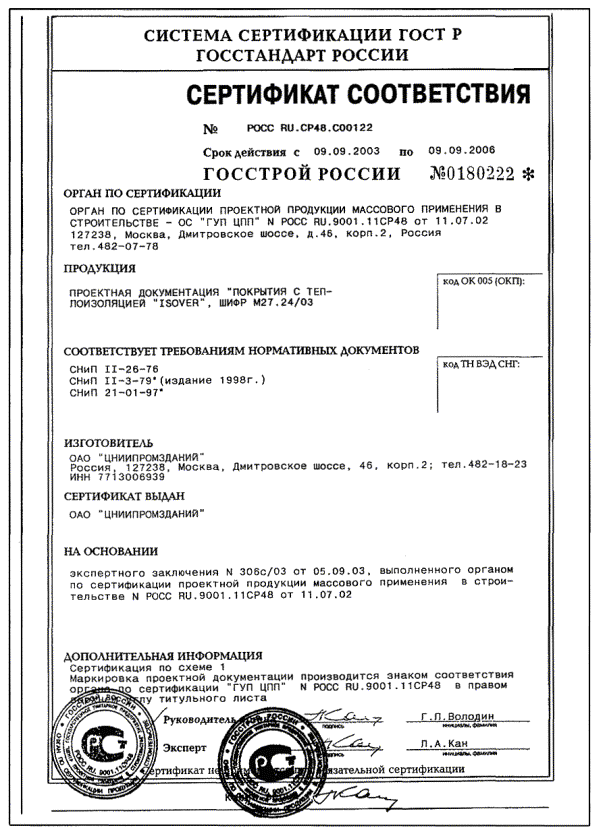 ОАО «ЦНИИПРОМЗДАНИЙ» ПОКРЫТИЯ С ТЕПЛОИЗОЛЯЦИЕЙ Материалы для проектирования и рабочие чертежи узлов Шифр М27.24/03 Зам. генерального директора С.М. Гликин Руководитель отдела А.М. Воронин Москва 2003 СОДЕРЖАНИЕ СЕРТИФИКАТ СООТВЕТСТВИЯ № РОСС RU CP48