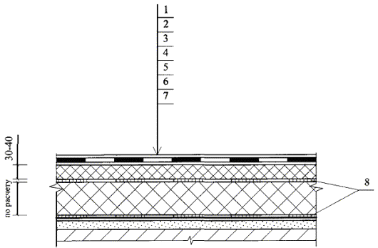 6.6. Необходимая толщина слоя теплоизоляции (см. табл. 8) из минераловатных плит ISOVER для покрытий трех типов зданий (раздел 2 альбома) с сухим и нормальным режимами помещений рассчитаны в соответствии с требованиями СНиП II-3-79* «Строительная теплотехника» и СНиП 23-01-99 «Строительная климатология». Значения сопротивления теплопередаче определены для tв = 18 °С. Для жилых зданий в районах с температурой наиболее холодной пятидневки (обеспеченностью 0,92) минус 31 °С и ниже - расчетная температура составляет 20 °С. Для г. Москвы градусо-сутки отопительного периода приняты по МГСН-2.01-99 «Энергосбережение в зданиях». Примеры расчета оптимальной толщины утеплителя даны в приложении 3. В вентилируемой конструкции покрытия величину сопротивления теплопередаче ограждения определяют путем вычитания 0,1 м2 ∙ °С/Вт из значения термического сопротивления слоя утеплителя с канавками, т. к. при вентилировании канавок наружным воздухом последний, проходя через ограждение, отнимает от него тепло, увеличивая теплоотдачу ограждения. Это приводит к незначительному ухудшению теплозащитных свойств покрытия и повышению его коэффициента теплопередачи. Таблица 8