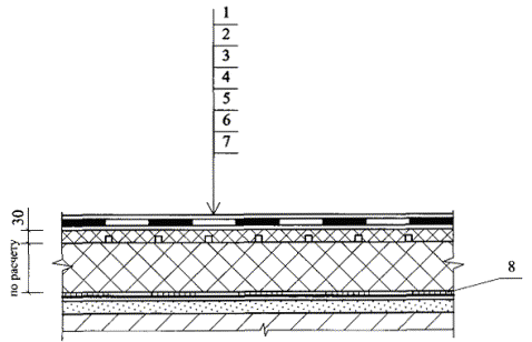 7. ОСНОВАНИЕ ПОД КРОВЛЮ7.1. Основанием под водоизоляционный ковер могут служить ровные поверхности: - теплоизоляционных плит с пределом прочности на сжатие при 10 % деформации не менее 0,06 МПа. При этом в кровлях с наклейкой водоизоляционного ковра из наплавляемых битумно-полимерных рулонных материалов, выполняемых методом подплавления покровного слоя, поверхность теплоизоляционных плит должна иметь защитный слой из приформованного стеклохолста; - выравнивающих монолитных стяжек из цементно-песчаного раствора с прочностью на сжатие не менее 5 МПа; - сборных (сухих) стяжек из асбестоцементных плоских прессованных листов толщиной 10 мм. Под монолитную цементно-песчаную стяжку при бетонном несущем основании рекомендуется применять теплоизоляционные плиты с пределом прочности на сжатие при 10 % деформации не менее 0,035 МПа, а по стальным профнастилам - не менее 0,045 МПа; - водоизоляционного ковра существующих кровель из рулонных или мастичных материалов (при производстве ремонтных работ). 7.2. На участках примыканий кровли к парапетам, деформационным швам и другим конструктивным элементам основанием под кровлю должны служить ровные поверхности конструкций и наклонные бортики высотой не менее 100 мм (под углом 45°) из теплоизоляционных материалов, применяемых для утепления покрытий, либо из цементно-песчаного раствора или легкого бетона. Бортики из теплоизоляционных материалов должны быть приклеены к основанию под кровлю. 7.3. Выравнивающая цементно-песчаная стяжка должна выполняться из жесткого (с осадкой конуса до 30 мм) раствора марок 50 - 100. Стяжку по плитам утеплителя следует выполнять толщиной не менее 30 мм, а затирку по железобетонному основанию - 10 - 15 мм. Укладку выравнивающей стяжки из цементно-песчаного раствора производят полосами шириной не более 3 м, ограниченными рейками, которые служат маяками. 7.4. В цементно-песчаной стяжке должны быть предусмотрены температурно-усадочные швы шириной 5 - 10 мм, разделяющие стяжку на участки не более 6×6 м, а при длине несущих плит 6 м - 3×3 м. Швы располагают над торцевыми швами несущих плит. 7.5. Температурно-усадочные швы в монолитных выравнивающих стяжках рекомендуется выполнять путем прорезки механической пилой. Допускается образовывать их путем установки реек при укладке цементно-песчаного раствора, которые удаляют после твердения материала стяжки, а швы заполняют мастикой с последующей односторонней наклейкой на шов полосок рулонного материала шириной 150 - 200 мм. Так же проклеивают стыки, образуемые листами сборной стяжки. 7.6. Для обеспечения необходимой адгезии рулонных кровельных материалов все поверхности основания из цементно-песчаного раствора или сборных стяжек, а также поверхность стеклохолста (при кашировальных теплоизоляционных плитах) и ремонтируемого (старого) водоизоляционного ковра должны быть огрунтованы грунтовочными холодными составами (праймерами), приготовленными из битума и керосина, взятых в соотношении 1:2 или 1:3 (по весу), или из клеящих мастик (типа бутилкаучуковой и т.п.), разбавленных растворителем или бензином в соотношении 1:2. Грунтовку наносят на выровненную сухую и обеспыленную поверхность при помощи окрасочного распылителя или вручную кистью. Грунтовка должна иметь прочное сцепление с основанием. На приложенном к ней после высыхания тампоне не должн