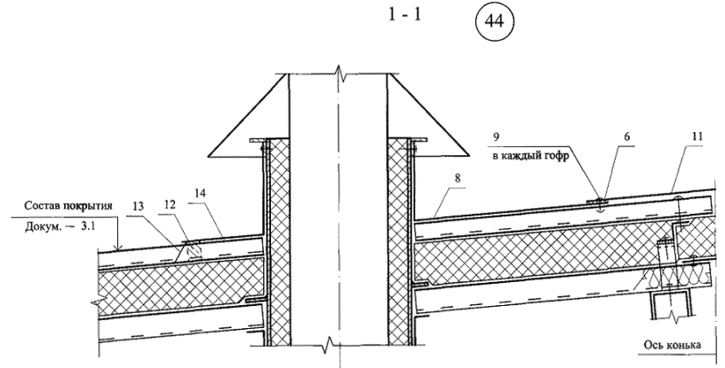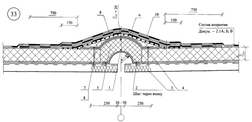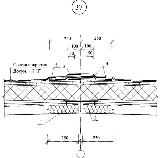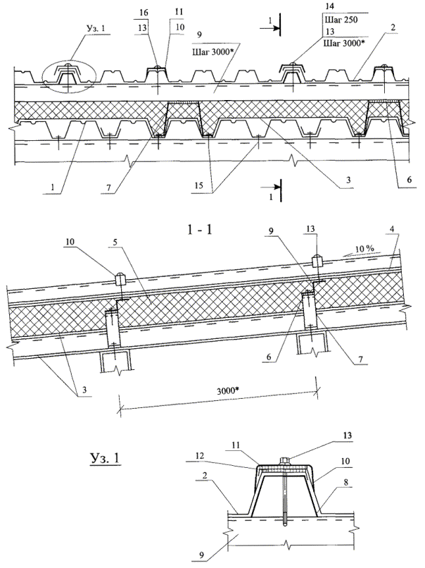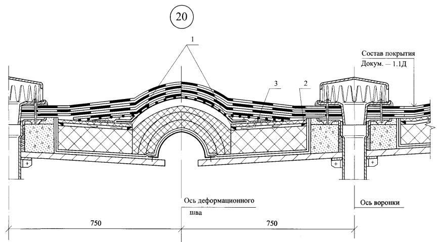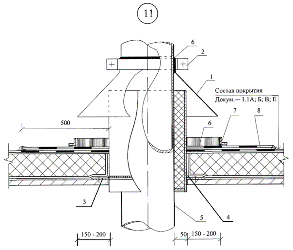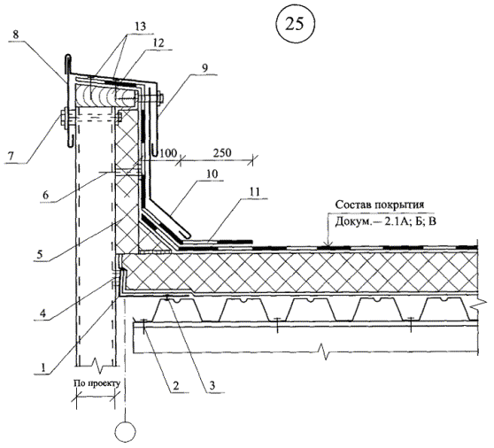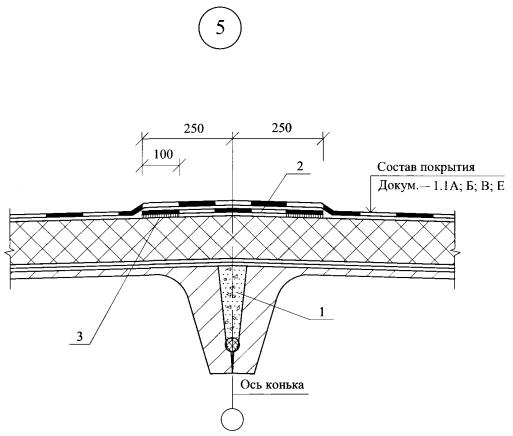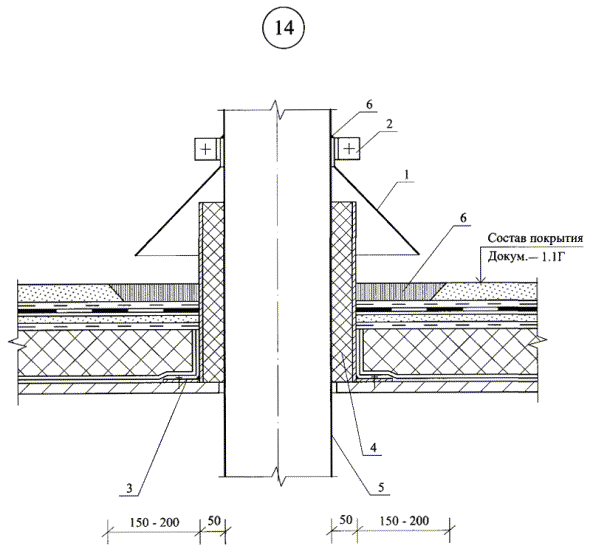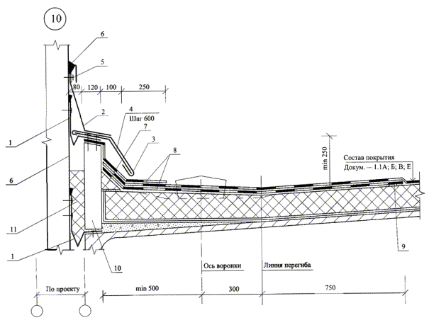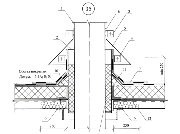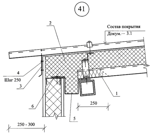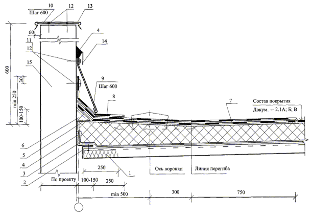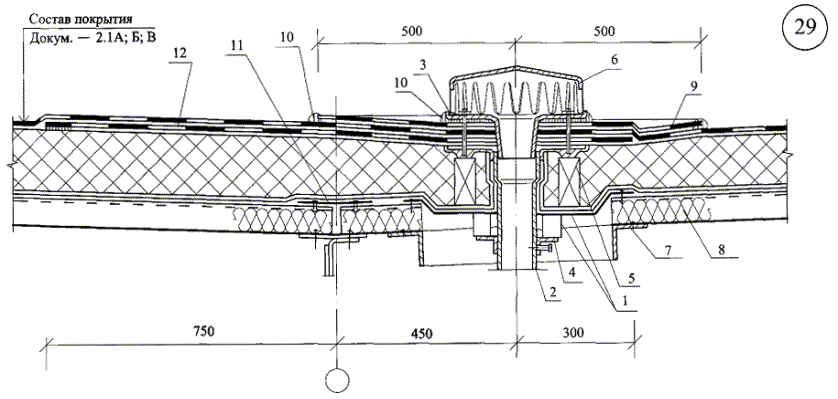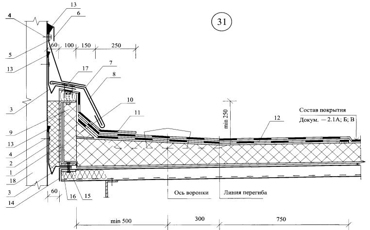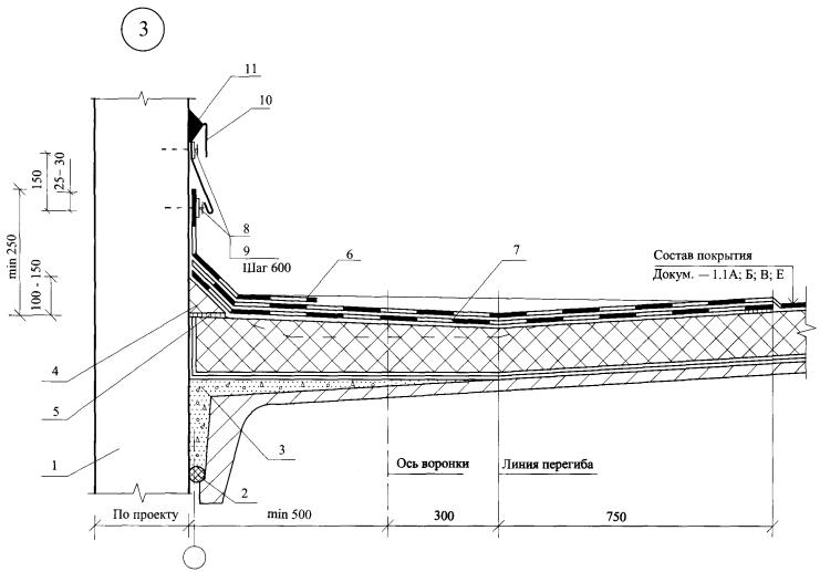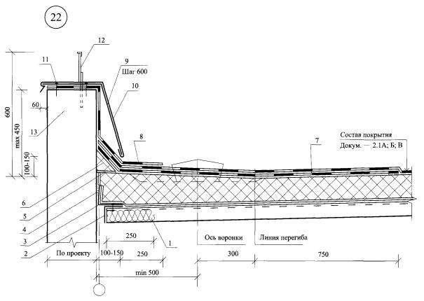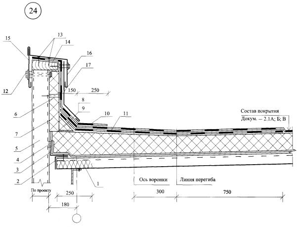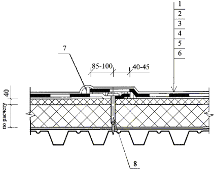 3.2. В общем случае покрытие включает следующие конструктивные слои: - несущее основание (железобетонное или из стальных оцинкованных профилированных настилов); - выравнивающую стяжку из цементно-песчаного раствора по железобетонному основанию; - пароизоляционный слой (для железобетонного основания - по расчету, по профнастилам - всегда); - теплоизоляцию из плит или матов ISOVER; - водоизоляционный ковер из рулонных материалов или из стальных профилированных листов (только при несущем основании из стальных профилированных настилов). 3.3. Деформационные швы в местах перепада высот пролетов решены с разрывом кровли и утеплителя с устройством стенок из кирпичной кладки, из железобетонной панели (докум. - 1.10, - 1.11) или стального швеллера на покрытии пониженного пролета. Швеллер устанавливают на прогон (докум. - 2.11) или на профнастил (докум. - 2.10). Установка швеллера производится в собранном виде с деревянным антисептированным и антипирерованным бруском, который крепится к швеллеру болтами М-10. К концам прогонов, примыкающих к стене высокого пролета, приваривают стальные пластины 220×120×10 мм. Полость между бортиком и стеной должна быть заполнена утеплителем ISOVER марки KL-E; KL; KL-A; KT; Dachoterm SL или OL-P, запаянным в полиэтиленовую пленку. 3.4. Деформационные швы при отсутствии перепада высот покрытия выполняют без разрыва кровли, с устройством ее по полуцилиндрическим выкружкам и компенсаторам (докум. - 2.12, - 2.13). Полость между компенсатором и выкружкой заполняют негорючим утеплителем ISOVER марки KL-E; KL; KL-A; KT; Dachoterm SL или OL-P, запаянным в полиэтиленовую пленку. На отгибы выкружки укладывают доборные элементы треугольной формы размером не менее 50×100 или 100×180 мм, нарезанные из основного теплоизоляционного материала. Участок основания доборных элементов, не заходящий на отгибы выкружки, склеивают с основанием под кровлю. 3.5. Бортик из швеллера и стальные оцинкованные компенсаторы должны быть окрашены материалами III группы покрытия в соответствии с указаниями СНиП 2.03.11-85 «Защита строительных конструкций от коррозии», а стыки между отдельными элементами компенсаторов загерметизированы мастикой «Эластосил 137-181» (ТУ 6-02-1-362-84). 3.6. Места пропусков через кровлю труб выполнены с применением стальных квадратных стаканов с фланцами (докум. - 1.12, - 1.14, - 2.14, - 3.5) и с закреплением их к несущему основанию. Места пропусков анкеров для крепления растяжек заполняют герметизирующей мастикой, заливаемой в рамки из уголков (докум. - 1.13). 3.7. Пропуск воронок внутреннего водостока через покрытие с несущими профнастилами осуществляется при помощи стального оцинкованного поддона, изготавливаемого методом штамповки (докум. - 2.7, - 2.8, - 2.9). Поддон крепят к настилу болтами М 6×14 (ГОСТ 7798-70). На покрытии из железобетонных плит патрубок с фланцем опирают на утеплитель из легкого бетона. Зазор между бетоном и патрубком заполняют минеральной ватой. Патрубок жестко закрепляют к плитам покрытия или к поддону стальными хомутами через резиновый уплотнитель. Основные и дополнительные слои кровли должны быть заведены на фланец патрубка. Прижимной фланец устанавливают на герметизирующей мастике и жестко закрепляют к чаше воронки. 3.8. Крепление защитных фартуков, компенсаторов, костылей и других стальных элементов к стенам из бетонных панелей выполняют «пристрелкой» дюбелями типа ДГ 3,7×70 Ц6 (ТУ 14-4-
