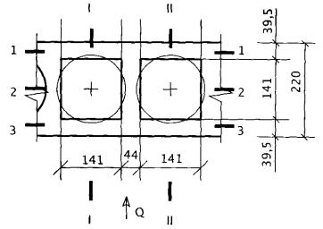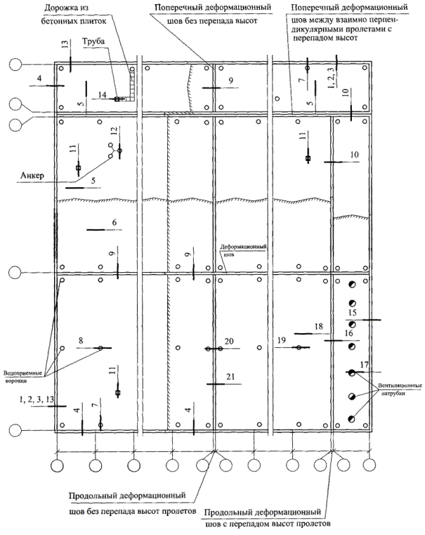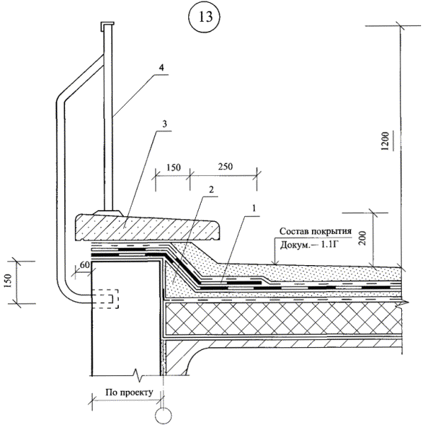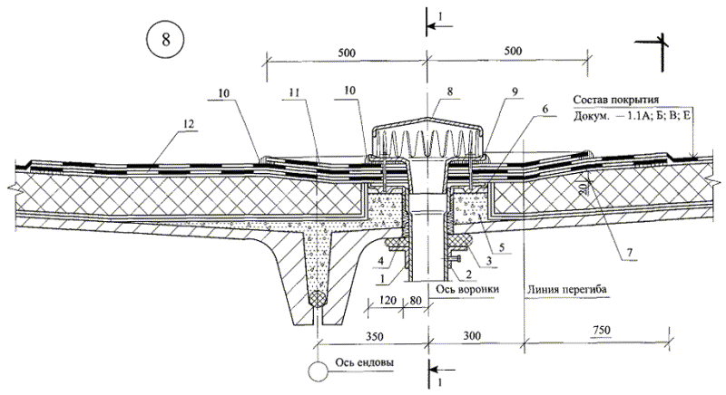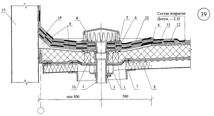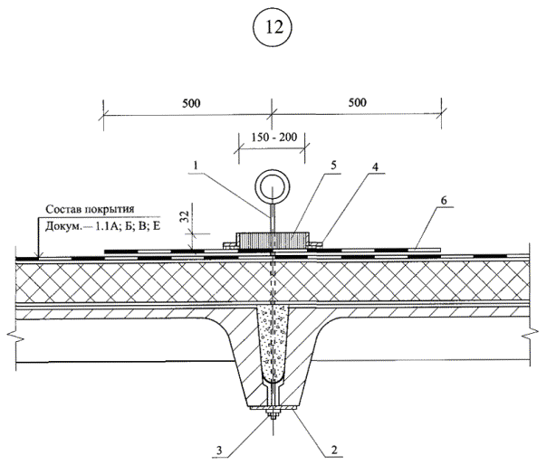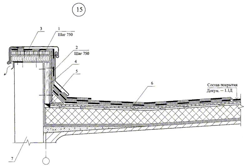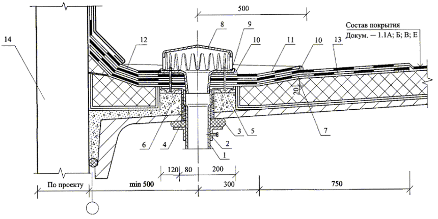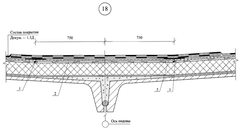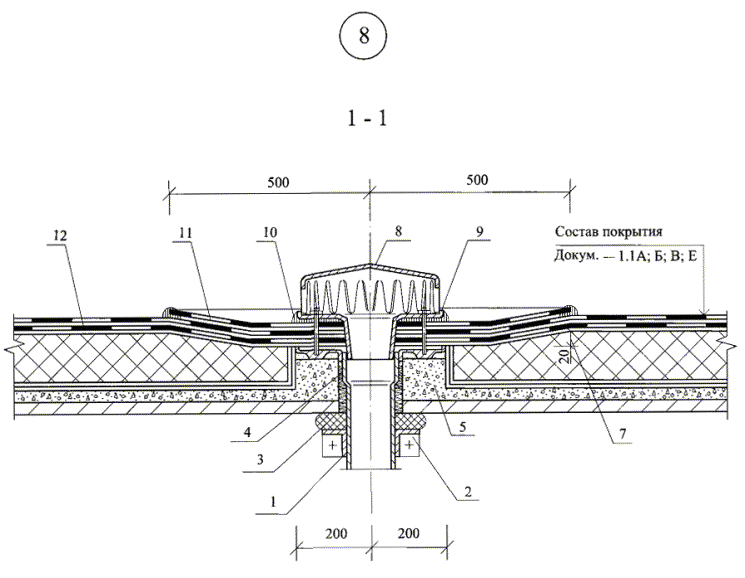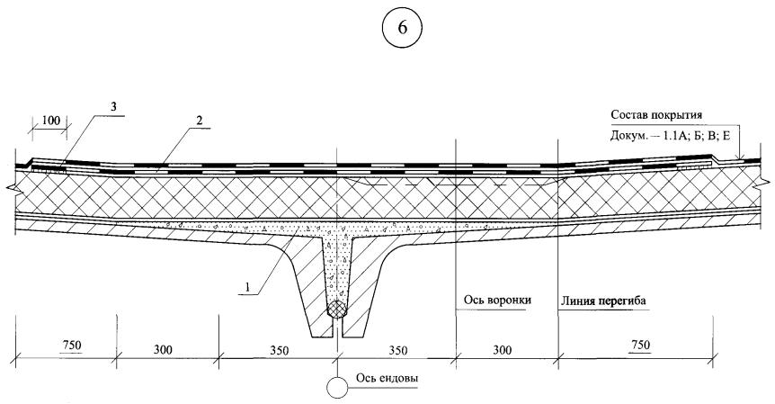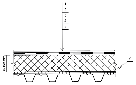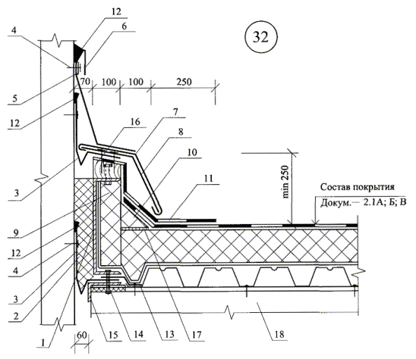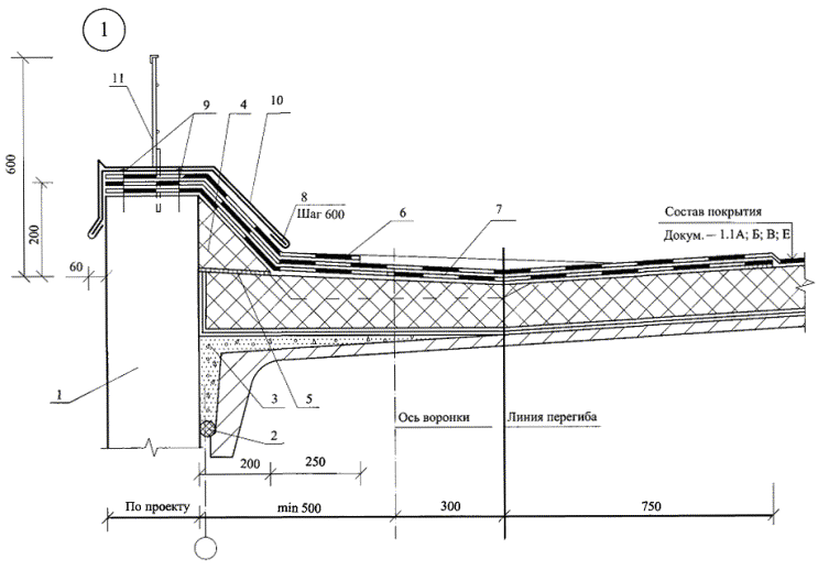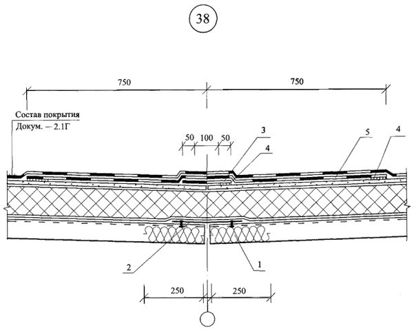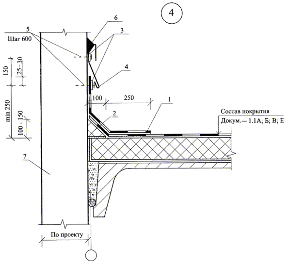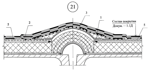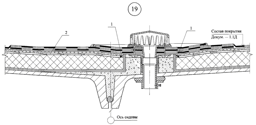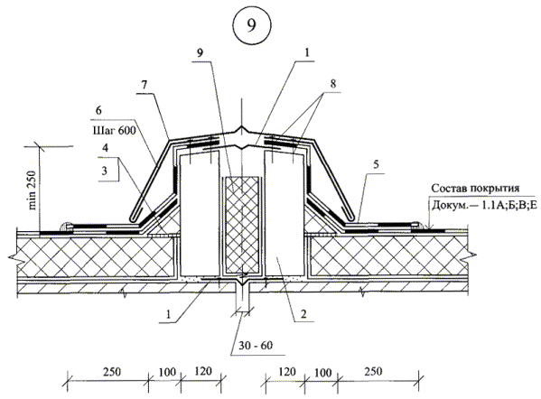 3.2. В общем случае покрытие включает следующие конструктивные слои: - несущее основание (железобетонное или из стальных оцинкованных профилированных настилов); - выравнивающую стяжку из цементно-песчаного раствора по железобетонному основанию; - пароизоляционный слой (для железобетонного основания - по расчету, по профнастилам - всегда); - теплоизоляцию из плит или матов ISOVER; - водоизоляционный ковер из рулонных материалов или из стальных профилированных листов (только при несущем основании из стальных профилированных настилов). 3.3. Деформационные швы в местах перепада высот пролетов решены с разрывом кровли и утеплителя с устройством стенок из кирпичной кладки, из железобетонной панели (докум. - 1.10, - 1.11) или стального швеллера на покрытии пониженного пролета. Швеллер устанавливают на прогон (докум. - 2.11) или на профнастил (докум. - 2.10). Установка швеллера производится в собранном виде с деревянным антисептированным и антипирерованным бруском, который крепится к швеллеру болтами М-10. К концам прогонов, примыкающих к стене высокого пролета, приваривают стальные пластины 220×120×10 мм. Полость между бортиком и стеной должна быть заполнена утеплителем ISOVER марки KL-E; KL; KL-A; KT; Dachoterm SL или OL-P, запаянным в полиэтиленовую пленку. 3.4. Деформационные швы при отсутствии перепада высот покрытия выполняют без разрыва кровли, с устройством ее по полуцилиндрическим выкружкам и компенсаторам (докум. - 2.12, - 2.13). Полость между компенсатором и выкружкой заполняют негорючим утеплителем ISOVER марки KL-E; KL; KL-A; KT; Dachoterm SL или OL-P, запаянным в полиэтиленовую пленку. На отгибы выкружки укладывают доборные элементы треугольной формы размером не менее 50×100 или 100×180 мм, нарезанные из основного теплоизоляционного материала. Участок основания доборных элементов, не заходящий на отгибы выкружки, склеивают с основанием под кровлю. 3.5. Бортик из швеллера и стальные оцинкованные компенсаторы должны быть окрашены материалами III группы покрытия в соответствии с указаниями СНиП 2.03.11-85 «Защита строительных конструкций от коррозии», а стыки между отдельными элементами компенсаторов загерметизированы мастикой «Эластосил 137-181» (ТУ 6-02-1-362-84). 3.6. Места пропусков через кровлю труб выполнены с применением стальных квадратных стаканов с фланцами (докум. - 1.12, - 1.14, - 2.14, - 3.5) и с закреплением их к несущему основанию. Места пропусков анкеров для крепления растяжек заполняют герметизирующей мастикой, заливаемой в рамки из уголков (докум. - 1.13). 3.7. Пропуск воронок внутреннего водостока через покрытие с несущими профнастилами осуществляется при помощи стального оцинкованного поддона, изготавливаемого методом штамповки (докум. - 2.7, - 2.8, - 2.9). Поддон крепят к настилу болтами М 6×14 (ГОСТ 7798-70). На покрытии из железобетонных плит патрубок с фланцем опирают на утеплитель из легкого бетона. Зазор между бетоном и патрубком заполняют минеральной ватой. Патрубок жестко закрепляют к плитам покрытия или к поддону стальными хомутами через резиновый уплотнитель. Основные и дополнительные слои кровли должны быть заведены на фланец патрубка. Прижимной фланец устанавливают на герметизирующей мастике и жестко закрепляют к чаше воронки. 3.8. Крепление защитных фартуков, компенсаторов, костылей и других стальных элементов к стенам из бетонных панелей выполняют «пристрелкой» дюбелями типа ДГ 3,7×70 Ц6 (ТУ 14-4-