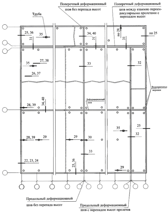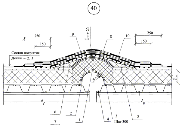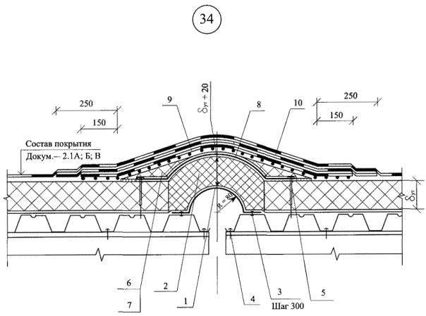 10. СОСТАВ РАБОЧИХ ЧЕРТЕЖЕЙ10.1. Конструктивные решения покрытий в виде схем и чертежей основных узлов представлены в трех разделах: 1. Покрытия со сборным или монолитным железобетонным основанием. 2. Покрытия по стальным профилированным настилам с кровлями из рулонных материалов. 3. Покрытия по стальным профилированным настилам с кровлями из стальных профилированных листов. 10.2. В конкретном проекте на основе данного альбома должны быть указаны: - марки теплоизоляционных и кровельных материалов; - толщина теплоизоляции; - количество слоев водоизоляционного ковра и способ устройства кровли. В проекте разрабатываются: - план кровли с маркировкой узлов; - схемы послойной раскладки теплоизоляционных плит; - способ крепления плит утеплителя к несущему основанию; - привязки водосточных воронок, пропусков инженерного оборудования и вентиляционных патрубков; - необходимые дополнительные узлы; - рабочие чертежи стальных фасонных элементов и комплектующих изделий. По всему выпуску в ссылках на документ условно опущен шифр работы М 27.24/03. РАБОЧИЕ ЧЕРТЕЖИРАЗДЕЛ 1.Покрытия со сборным или монолитным железобетонным основаниемКонструктивные