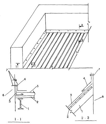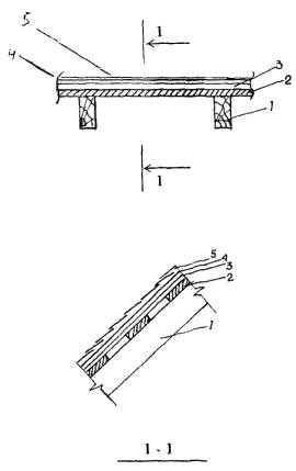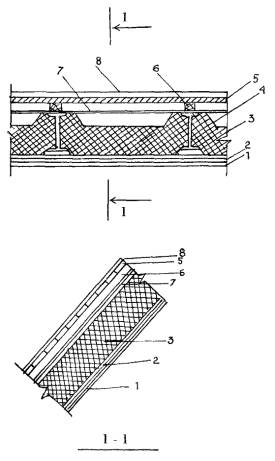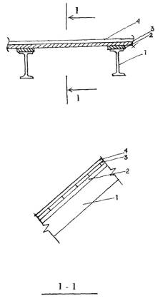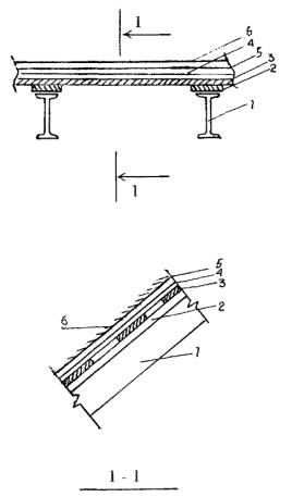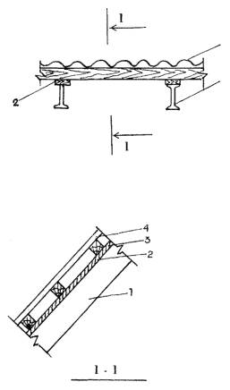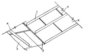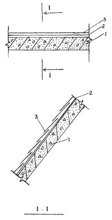 2. КОНСТРУКТИВНЫЕ РЕШЕНИЯ ПОКРЫТИЯ КРОВЕЛЬ2.1. Скатные кровли могут выполняться в двух вариантах: с холодным или теплым чердаком. Несущими конструкциями могут быть деревянные стропила (рис. 1, 3, 7, 9), металлические стропила (рис. 2, 4, 8, 10) или железобетонные плиты (рис. 5, 6). Рис. 1. Кровля с несущими деревянными конструкциями и водоизоляционным ковром из плоских листов: 1 - деревянные стропила; 2 - обрешетка; 3 - водоизоляционный ковер из цинк-титановых или медных листов Рис. 2. Кровля с несущими металлическими конструкциями и водоизоляционным ковром из плоских листов: 1 - металлические стропила; 2 - продольные доски или бруски; 3 - обрешетка; 4 - водоизоляционный ковер из цинк-титановых или медных листов Рис. 3. Кровля с несущими деревянными конструкциями и водоизоляционным ковром из профильных листов: 1 - деревянные стропила; 2 - обрешетка; 3 - водоизоляционный ковер из профилированных листов, гофрированных листов, металлочерепицы, цементно-песчаной черепицы Рис. 4. Кровля с несущими металлическими конструкциями и водоизоляционным ковром из профильных листов: 1 - металлические стропила; 2 - продольные доски или бруски; 3 - обрешетка; 4 - водоизоляционный ковер из профилированных листов, гофрированных листов, металлочерепицы, цементно-песчаной черепицы Рис. 5. Кровля с несущей железобетонной плитой: 1 - железобетонная плита; 2 - пароизоляция; 3 - деревянные бруски; 4 - водоизоляционный ковер из плоских или профильных листов, цементно-песчаной черепицы Рис. 6. Кровля с несущей железобетонной плитой: 1 - железобетонная плита; 2 - подкладочный слой; 3 - водоизоляционный ковер из мягкой черепицы Рис. 7. Конструкция мансардной кровли с несущими деревянными конструкциями: 1 - подшивной потолок; 2 - пароизоляция; 3 - деревянные стропила; 4 - утеплитель; 5 - диффузионная пленка; 6 - обрешетка; 7 - деревянные бруски; 8 - водоизоляционный ковер из плоских или профильных листов, цементно-песчаной черепицы Рис. 8. Конструкция мансардной кровли с несущими металлическими конструкциями: 1 - подшивной потолок; 2 - пароизоляция; 3 - металлические стропила; 4 - утеплитель; 5 - диффузионная пленка; 6 - обрешетка; 7 - деревянные бруски; 8 - водоизоляционный ковер из плоских или профильных листов, цементно-песчаной черепицы Рис. 9. Кровля с несущими деревянными конструкциями и водоизоляционным ковром из мягкой черепицы: 1 - деревянные стропила; 2 - обрешетка; 3 - водостойкая фанера; 4 - подкладочный слой; 5 - мягкая черепица Рис. 10. Кровля с несущими металлическими конструкциями и водоизоляционным ковром из мягкой черепицы: 1 - металлические стропила; 2 - продольные доски или бруски; 3 - обрешетка; 4 - водостойкая фанера; 5 - подкладочный слой; 6 - мягкая черепица 2.2. При холодном чердаке пароизоляция и теплоизоляционный слой укладывают на перекрытие; водоизоляционный слой укладывают на основание по скатам. При теплом чердаке вся конструкция покрытия укладывается по скатам. 2.3. Водоизоляционный ковер выполняется из одного слоя листовых материалов на основе сплава цинк-титана, меди (рис. 1, 2, 5, 7, 8); профильных листов (профилированные листы, гофрированные листы, металлочерепица), цементно-песчаной черепицы (рис. 3, 4, 5, 7, 8) или мягкой черепицы (рис. 6, 9, 10). 2.4. В местах примыканий к вертикальным поверхностям (рис. 12) и технологическим трубопроводам (рис. 15) проектом должно быть предусмотрено устройство дополнительных слоев 