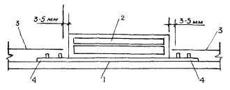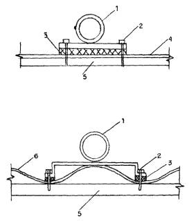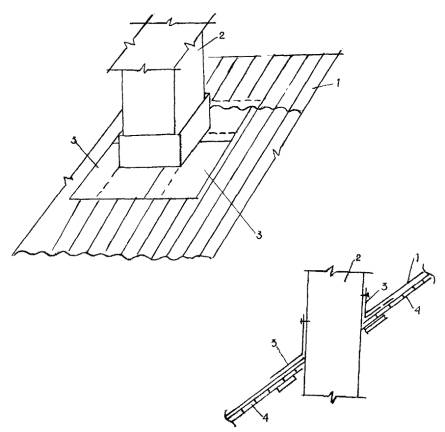 Рис. 13. Примыкание водоизоляционного ковра к мансардным окнам: 1 - обрешетка; 2 - переплет мансардного окна; 3 - водоизоляционный ковер; 4 - фартук мансардного окна Рис. 14. Место примыкания водоизоляционного ковра к вентшахтам, дымоходам и т.п.: 1 - водоизоляционный ковер; 2 - шахта, дымоход и т.п.; 3 - фартуки или специальная деталь; 4 - обрешетка Рис. 15. Место примыкания водоизоляционного ковра к технологическим трубопроводам: 1 - водоизоляционный ковер; 2 - фасонная деталь из металла; 3 - технологический трубопровод; 4 - стоячий фальц; 5 - лежачий фальц; 6 - обрешетка Рис. 16. Узлы крепления анкеров при различных материалах водоизоляционных ковров: 1 - анкер; 2 - саморез; 3 - резиновая прокладка; 4 - плоский лист или мягкая черепица; 5 - обрешетка, брусок или железобетонная плита; 6 - профильный лист 6. КОНТРОЛЬ КАЧЕСТВА РАБОТ6.1. Контроль качества используемых материалов возлагается на строительную лабораторию; производства работ - на мастера или бригадира. 6.2. К укладке материалов для паро- и гидроизоляции приступают после подписания акта на скрытые работы по устройству основания. 6.3. К укладке металлических листов или мягкой черепицы приступают после подписания акта на скрытые работы по укладке нижележащих слоев. 6.4. В процессе производства работ устанавливается постоянный контроль за соблюдением технологии выполнения отдельных этапов работ. На объекте заводится «Журнал производства работ». 6.5. Качество укладки материалов и устройства мест примыканий устанавливается путем осмотра их поверхности, при этом должны выполняться следующие условия: - отсутствие порезов, отверстий и других дефектов; - соблюдение размеров нахлестки в местах соединения металлических листов и мягкой черепицы; - соответствие проекту фальцевых соединений и мест примыкания к вертикальным поверхностям. 6.6. Обнаруженные при осмотре слоев дефекты или отклонения от проекта должны быть устранены до подписания акта на выполненные работы по укладке материалов. 7. ОХРАНА ТРУДА И ТЕХНИКА БЕЗОПАСНОСТИ7.1. Работы по устройству водоизоляционных слоев из новых материалов должны производиться в соответствии с требованиями СНиП 12-03-2001 «Безопасность труда в строительстве», «Правилами пожарной безопасности в Российской Федерации» (ППБ-01-03). 7.2. К работам по устройству водоизоляционных слоев из новых материалов допускаются мужчины не моложе 18 лет, прошедшие предварительный (при поступлении на работу) и периодический медицинские осмотры, имеющие наряд-допуск. 7.3. Работы по устройству водоизоляционных слоев из новых материалов производятся только при использовании средств индивидуальной защиты (СИЗ). Для защиты тела должны быть использованы брезентовые комбинезоны (ГОСТ 27653-88); для защиты ног - ботинки кожаные (ГОСТ 28507-90); для защиты рук - брезентовые рукавицы (ГОСТ 12.4.010-75 ССБТ). 7.4. Допуск рабочих к выполнению работ разрешается только после осмотра основания, ограждений и мест страховки прорабом или мастером вместе с бригадиром. 7.5. По окончании работ (смены) материалы и инструменты должны быть убраны с кровли. 7.6. Место производства работ должно быть обеспечено следующими средствами пожаротушения и медицинской помощи: - огнетушитель пенный марки ОХП-10 (ТУ 22-4720-80) из расчета на одну секцию кровли, не менее 2 шт. - ящик с песком емкостью 0,05 м3 1 шт. - лопата 2 шт. - асбестовое полотно 1 м2 - аптечка с наборо