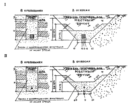 Рис. 7. Принципиальные конструктивные схемы горизонтальных дренажей с применением перфорированных гофрированных труб с ЗФО, укладываемых в траншею (однолинейный дренаж): I - с обсыпкой щебнем; II - без обсыпки 3.4.1.8. Песок для обратной засыпки траншей должен иметь коэффициент фильтрации не менее 5 м/сут. 3.4.2. Сопутствующие дренажи3.4.2.1. Совмещенная прокладка дренажа в одном котловане под сооружение или в одной траншее с подземными коммуникациями (сопутствующий дренаж) применяется с целью сокращения объемов работ, включая уменьшение объемов выемки грунта, а также с целью повышения эффективности защитного действия дренажа при снижении затрат на его устройство. 3.4.2.2. Основными видами дренажей являются пристенные, пластовые и сопутствующие дренажи. 3.4.2.3. Пристенный дренаж устраивается вдоль внешнего контура подземной части здания при необходимости защиты от подтопления подвальных помещений или оснований фундаментов, располагаемых на водоупоре. Пристенные дренажи перехватывают и отводят как грунтовые воды бокового притока, так и инфильтрационные воды, накапливающиеся в грунтах обратной засыпки пазух котлованов, траншей и т.д. 3.4.2.4. Пластовые дренажи представляют собой своеобразные фильтрующие пласты-постели. Их применяют для защиты от подтопления подвалов отдельных зданий, подземных резервуаров, а также заглубленных коммуникаций. Применение пластовых дренажей эффективно в слабопроницаемых грунтах. В некоторых случаях целесообразно сочетание пристенного и пластового дренажей.