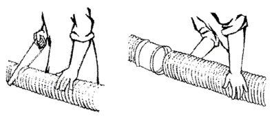 Рис. 9. Конструктивная схема сопутствующего дренажа с применением перфорированных гофрированных труб с ЗФО 3.4.3. Принципиальные схемы3.4.3.1. Принципиальные схемы дренажей с применением перфорированных гофрированных полиэтиленовых труб с ЗФО не отличаются от схем трубчатых дренажей с использованием других видов труб, являющихся основой дренажной конструкции. Однако в рассматриваемом случае устройство дренажных конструкций основывается на предварительно (технологически обусловленном) установленном размере и форме дренажных отверстий, и проектирование дренажной конструкции ведется с уже заданными параметрами водоприемных отверстий в стенке трубы. При этом конструктивная схема дренажа может быть с щебеночной обсыпкой или без нее. 4. СТРОИТЕЛЬСТВО ДРЕНАЖЕЙ И ПРИЕМКА ИХ В ЭКСПЛУАТАЦИЮ4.1. Дренажные трубы укладывают в траншею, дно которой выровнено по нивелиру для придания трубопроводу проектного уклона в соответствии с регламентом. 4.2. Ширина траншеи по дну равна наружному диаметру трубопровода плюс 40 см. 4.3. В поперечном сечении траншея может иметь прямоугольное или трапецеидальное очертание. В первом случае стенки траншеи укрепляют инвентарными щитами, во втором - откосами 1:1. 4.4. Дно траншеи не должно содержать твердых включений (комков земли, обломков кирпича, камня и т.д.), которые могут продавить нижнюю стенку уложенной на них трубы. 4.5. Перед монтажом дренажные гофрированные трубы раскладывают на бровке траншеи. Все трубы и комплектующие проходят входной контроль качества. 4.6. Монтаж трубопровода проводится на дне траншеи, где трубы последовательно одна за другой вставляются в раструб муфты, надетой гладкий конец предыдущей трубы. При необходимости трубы между гофрами отрезают ножовкой по дереву или по металлу (рис. 10). Рис. 10. Монтаж трубопровода 4.7. Монтаж соединений выполняют с помощью рычага, упираемого в перекладину, устраиваемую поперек сечения гладкого конца вдвигаемой трубы. 4.8. По окончании монтажных работ трубопровод дренажа из труб с ЗФО при необходимости, в соответствии с составом дренируемых грунтов, обсыпается дренирующими обсыпками. Подбор состава дренирующих обсыпок производят по специальным графикам в зависимости от типа фильтра и состава дренируемых грунтов. 4.9. В слабых грунтах с недостаточной несущей способностью дренаж должен быть уложен на искусственное основание. 4.10. Гидравлические испытания дренажных труб не производятся. Качество монтажа контролируется в процессе сборки трубопровода. При этом обеспечивается соответствие монтируемого трубопровода проекту: его прямолинейность достигается обсыпкой грунтом, который служит им фиксатором, а уклон контролируется нивелиром. 4.11. Монтаж трубопроводов производится при температуре наружного воздуха до - 10 °С.