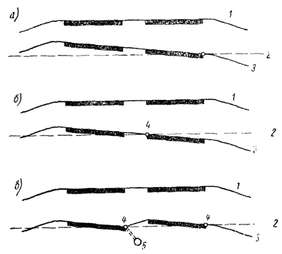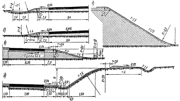 Пользуясь зависимостями, предложенными К.А. Хавкиным, можно определить скорости автомобиля на разных участках дороги, запроектированной в предельном профиле вертикальными кривыми. Результаты расчетов показывают, что проектирование продольного профиля вертикальными кривыми не только повышает безопасность движения, но и улучшает технико-экономические показатели автомобильных дорог. Уменьшение величины продольного уклона при движении по выпуклой вертикальной кривой способствует преодолению подъемов. Следует иметь в виду, что изложенному методу расчета скоростей движения присущи все недостатки, имеющиеся у метода расчета по динамическим характеристикам, в том числе предпосылка о движении с постоянной степенью открытия дросселя. Между тем в реальных условиях движения по дороге водители меняют степень открытия дросселя в широких пределах, уменьшая ее при возрастании скорости и, наоборот, увеличивая по мере затухания при движении на подъем. Закономерности этих изменений не изучены; результаты теоретических расчетов скоростей движения отличаются от измеренных в натуре. Это не снижает, однако, их значения для сравнения вариантов продольного профиля. § 3. Земляное полотно автомагистралей и отвод водыДля автомагистралей характерно обтекаемое очертание земляного полотна с пологими откосами и округленными бровками, которое, начиная с тридцатых годов, все шире применяется в дорожном строительстве (рис. 5). Рис. 5. Обтекаемые поперечные профили земляного полотна: а - г - в насыпях; д - в выемках Пологие откосы, плавно сливающиеся с поверхностью прилегающей придорожной полосы, имеют ряд преимуществ. 1. Повышается безопасность движения. При пологих откосах и замене глубоких канав мелкими лотками автомобиль, потерявший управление, имеет возможность съехать по пологому откосу с насыпи. 2. Водитель видит всю поверхность откоса, а не только бровку земляного полотна, как при движении по дороге с крутыми откосами. Это психологически придает водителям большую уверенность в управлении автомобилем и способствует лучшему использованию ими ширины проезжей части. 3. При пологих откосах земляное полотно хорошо обтекается снего-ветровым потоком, и снег переносится через него, не откладываясь на проезжей части. 4. Пологие откосы меньше размываются водой, стекающей с земляного полотна после дождей и при таянии снега. Очертание поперечных профилей земляного полотна, рекомендуемого техническими условиями разных стран, варьирует в широких пределах. Однако сопоставление обтекаемых поперечных профилей позволяет выявить некоторые общие тенденции в области проектирования поперечных профилей земляного полотна за последние годы: 1) мелкие выемки и невысокие насыпи обязательно устраивают с пологим заложением откосов, тем большим, чем ниже насыпь; 2) откосы выемок сопрягают с прилегающей поверхностью грунта по круговым кривым малого радиуса; 3) в условиях пересеченного рельефа, когда при проектировании ставится задача лучшего вписывания дороги в ландшафт, откосам выемок и насыпей придается переменная крутизна, меняющаяся как по высоте, так и по протяжению дороги в зависимости от величины рабочих отметок. Последний вопрос детально рассмотрен в литературе по ландшафтному проектированию дорог*. * В.Ф. Бабков. Увязка автомобильных дорог с ланд