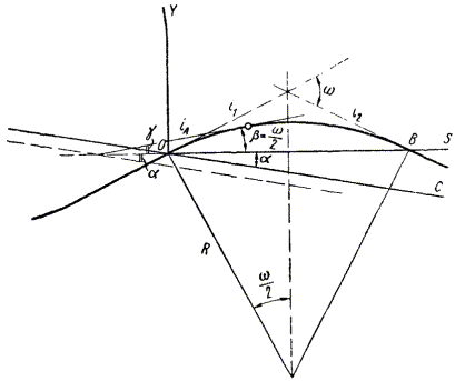 Согласно рис. 4 внешний угол перелома продольного профиля ω = i1 + i2, а угол наклона хорды к горизонтали