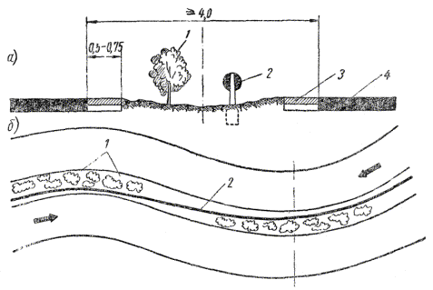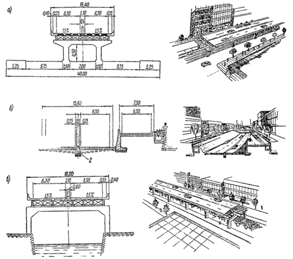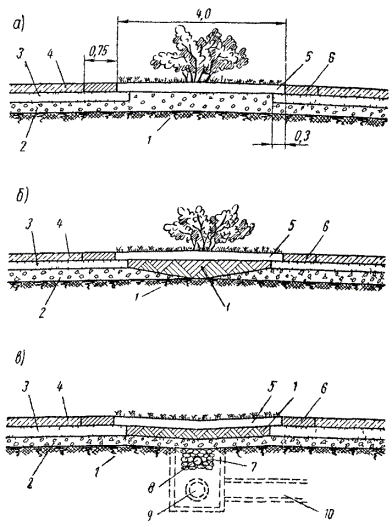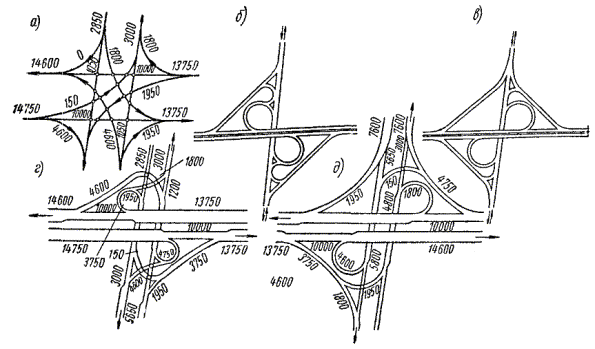 Проектирование сооружений системы водоотвода с автомагистралей имеет некоторые особенности. Наиболее целесообразно устраивать водопропускные сооружения в виде труб, над которыми конструкция земляного полотна не меняется. На малых и средних мостах ширина проезжей части и обочин также не должна изменяться по сравнению с прилегающими участками. Поскольку автомагистрали проектируют для скоростного автомобильного движения, на них избегают устраивать глубокие боковые канавы и резервы, создающие значительную опасность аварий в случае съезда автомобиля с земляного полотна. Для невысоких насыпей на автомагистралях наиболее характерен поперечный профиль с лотками глубиной 50 - 60 см, имеющими очень пологие откосы и округленное дно. В выемках и в местах, где невозможен съезд с насыпей, можно устраивать канавы обычного типа, обязательно устанавливая около них ограждения, препятствующие съезду автомобиля. Большие затруднения представляет отвод воды с разделительной полосы. Разделительные полосы шире 1,5 - 2 м устраивают грунтовыми, покрытыми дерном. Во время дождей и таяния снега они становятся источниками дополнительного увлажнения земляного полотна. Накапливаясь с осени в средней части земляного полотна, вода может способствовать в условиях сурового климата интенсивному пучинообразованию. Поэтому под разделительными полосами, особенно если они имеют вогнутое очертание, иногда закладывают самостоятельные дренажные устройства, из которых вода систематически отводится в понижения местности. Такой способ отвода воды возможен в теплом климате, когда отсутствует опасность образования льда в водостоках во время зимних оттепелей. Особенно удобен он в условиях пересеченного рельефа, легко позволяющего осуществить отвод воды из водостоков, не устраивая длинных подземных коллекторов. Конструкция разделительной полосы должна предусматривать возможность уменьшения количества просачивающейся воды и быстрого ее отвода (рис. 6). Для этого укрепленный вяжущими материалами противопучинный слой иногда продолжают на часть разделительной полосы, уменьшая тем самым ширину проницаемой полосы, через которую может просачиваться вода. Верхнюю часть противопучинного слоя под разделительной полосой устраивают из уплотненного гравелистого грунта, пригодного для роста растений, поверх которого укладывают слой гумусного грунта. Рис. 6. Конструкция разделительной полосы и схема водоотвода а - со сплошным крупнозернистым слоем; б - с прерванным крупнозернистым слоем; в - с отводом воды подполосным дренажом; 1 - грунт земляного полотна; 2 - крупнозернистый хорошо дренирующий материал; 3 - основание из щебня или грунта, обработанного вяжущими материалами; 4 - цементобетонное покрытие; 5 - растительный слой; 6 - краевая полоса; 7 - каменная засыпка; 8 - подполосная дрена для отвода воды из дренирующего слоя; 9 - коллектор; 10 - отводная труба Особенности отвода воды с разделительной полосы на кривых были рассмотрены выше при рассмотрении конструкций виражей. § 4. Пересечения автомагистралей и примыкания к ним автомобильных дорогВыбор расчетной схемы Обеспечение бесперебойности движения по автомагистралям требует устранения взаимных помех для транспортных потоков на пересечениях с другими дорогами. Возможные направления движения на пересечения