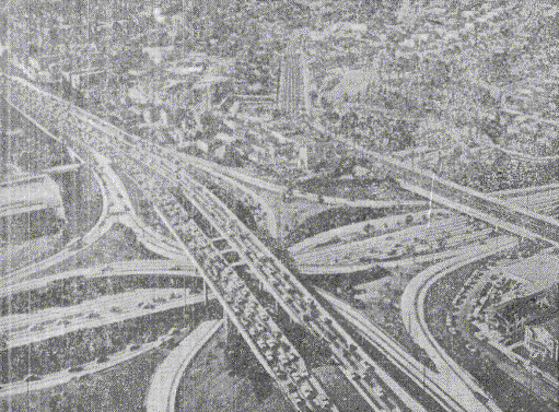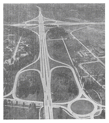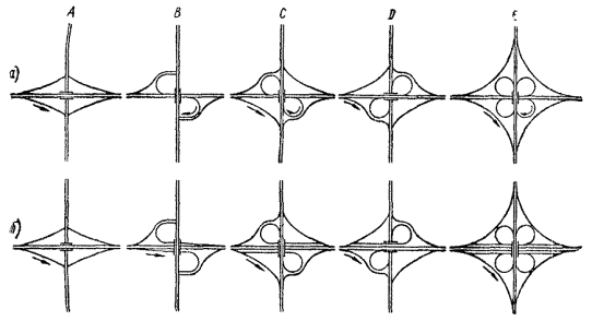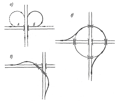 На автомагистралях с весьма большой интенсивностью движения, особенно при большом проценте сворачивающих налево автомобилей, суммарные потери транспорта в результате перепробегов становятся весьма большими. В таких условиях, а также при стесненных площадях, которыми можно воспользоваться для строительства, может экономически оправдаться постройка пересечения левоповоротного типа, у которого для заезда влево имеются специальные рампы, расположенные по кратчайшему направлению. Это может быть осуществлено лишь с помощью устройства пересечения в четырех уровнях. Путепроводы на пересечении превращаются в весьма сложное дорогостоящее сооружение (рис. 10). Рис. 10. Пересечение левоповоротного типа в четырех ярусах Наиболее известное пересечение левоповоротного типа было осуществлено в Калифорнии (США) на пересечениях скоростных автомагистралей в г. Лос-Анжелосе. Суммарная интенсивность движения по обеим пересекающимся автомагистралям превышает 300000 авт/сутки. Кольцевое решение, предоставляющее большие удобства, чем клеверный лист, для левоповоротного движения более экономичное. Однако его осуществление требует устройства пяти путепроводов и выполнения большого объема земляных работ, поскольку распределительное кольцо располагается в высокой насыпи. Описанные типы пересечений предоставляют одинаковые удобства для движения, следующего во всех направлениях, и предполагают, таким образом, что интенсивности движения во всех направлениях одинаковы, а дороги равнозначны по категориям. На практике такие случаи сравнительно редки. Обыкновенно интенсивности движения на съездах в разных направлениях значительно отличаются друг от друга. Это дает возможность снижать стоимость постройки пересечений путем индивидуального проектирования их схемы, обеспечивая большее удобство наиболее напряженным направлениям и меньшее - для съездов, которыми пользуется мало автомобилей. Такую возможность широко используют в США и Канаде, где схемы пересечений в разных уровнях обычно назначают путем индивидуального проектирования на основе изучения потоков движения в каждом из направлений, учитывая местные условия рельефа, ситуации и возможности отвода необходимых земель. В ФРГ, наоборот, применяют только симметричные пересечения. При проектировании пересечений неполного типа обеспечивают беспрепятственные условия движения по дороге магистрального типа или для дороги, по которой интенсивность является наибольшей. Съезды с этих дорог устраиваются обязательно. С второстепенной дороги, если интенсивность потоков движения, поступающих с нее на магистраль, невелика, съезды в отдельных направлениях не устраивают. Немногочисленные автомобили, которым нужно попасть на автомагистраль, разворачиваются в удобном месте и пользуются въездом для транспорта, следующего в противоположном направлении. Надежность получаемых таким образом планировочных решений во многом зависит от обоснованности перспективных интенсивностей движения, установленных при экономических изысканиях. При грубых ошибках в определении грузопотоков могут создаваться значительные помехи для движения, которые могут даже вызвать необходимость перестройки транспортной развязки. Проектирование пересечений указанного типа широко практиковалось в целях сни