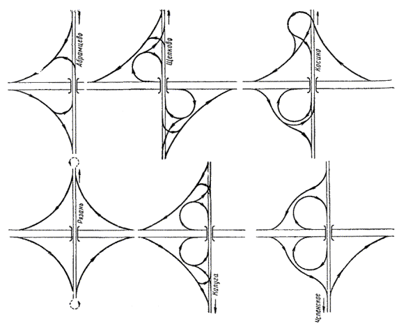 При конструировании плана пересечений в разных уровнях желательно обеспечивать единообразие их планировки на всем протяжении дороги. Для удобства пользования дорогой очень важно, чтобы водители знали, что во всех случаях прямому направлению соответствует определенная полоса дороги, а левый поворот на всех пересечениях начинается в одном месте, например сразу после проезда путепровода. На рис. 15, а показаны примеры, когда пересечения на дороге были запроектированы с различным числом въездов и съездов. Водитель, заметивший во время первой поездки по пересечениям А и Д, что для правого и левого поворотов он должен следовать по первому ответвлению, при следующем рейсе на пересечениях С и Е может поехать по неправильному пути. На пересечении В у него до завершения маневра могут оставаться сомнения в правильности избранного маршрута. На рис. 15, б показаны мероприятия, которыми может быть обеспечена однородность маневров на всех пересечениях того же маршрута, несмотря на разнотипность их конструкции. Водитель, которому необходимо съехать с дороги, во всех случаях должен пользоваться правым поворотом, начинающимся перед мостом на пересекающей дороге. Маневр осуществляется по дополнительной полосе, не мешающей транспортному движению. Всегда необходимо применять наиболее простое и понятное размещение съездов с дороги. Наиболее рациональны пересечения, у которых ответвления совмещены вместе. Это облегчает ориентировку водителей на пересечении, упрощает перестроения автомобилей и расстановку указательных знаков. Рис. 15. Схема расположения пересечений на маршруте: а - неудачная (бессистемное расположение въездов); б - удачная (однотипное расположение) Для подчеркивания главного направления дороги полосы разгона и торможения целесообразно отделять от основных полос проезжей части разделительной полосой шириной 0,5 - 1,0 м, отличающейся от них по цвету. Наиболее целесообразно использовать готовые бетонные плитки, укладывая поочередно плиты из белого и темного бетона. Для большего различия от основных полос движения покрытия на съездах должны отличаться от покрытия основной проезжей части. За границей иногда устраивают их из мостовых усовершенствованных типов - брусчатки или мозаики. Асфальтобетонные покрытия съездов должны иметь повышенную шероховатость. § 5. Проложение автомагистралей в районе населенных пунктов. Городские автомагистралиАвтомагистрали, как уже отмечалось выше, предназначены для дальних перевозок. Перевозки малого объема между расположенными поблизости друг от друга населенными пунктами должны осуществляться по местным дорогам, не имеющим выезда на автомагистрали для скоростного движения. Поэтому автомагистрали должны обходить все малые населенные пункты. Сложнее решается вопрос о проложении автомагистралей вблизи от крупных поселков и городов. Так как с железнодорожного транспорта снимаются короткопробежные грузы, вокруг городов появляются интенсивные грузопотоки на расстоянии до ста и более километров. Чем крупнее населенный пункт, тем больше объем местного движения на примыкающих к нему участках дорог и тем меньше относительный процент транзитного движения. Осреднение данных наблюдений, проведенных в ряде стран (ФРГ, Англия, США), приводит к следующей зависимости доли транзитных авто