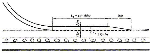 Для I и II категорий расчетные скорости на съездах следует считать заниженными. Для четкой и безопасной организации движения по пересечениям в разных уровнях важно разделить автомобили, продолжающие движение прямо, от автомобилей, сворачивающих на съезд. Если полоса съезда примыкает непосредственно к проезжей части, что иногда допускают в целях снижения стоимости строительства, то поворачивающие автомобили начинают интенсивно притормаживать перед съездом, задерживая общий поток движения и подвергаясь опасности наезда. Чтобы устранить это явление, на пересечениях устраивают дополнительные полосы разгона и замедления («скоростные шлюзы») (рис. 14). Рис. 14. Схема устройства полос разгона и торможения («скоростные шлюзы») На полосах замедления автомобили, съезжающие с дороги, притормаживают до скоростей проезда по петлям пересечений. Длину полос замедления рассчитывают исходя из величины отрицательного ускорения при торможении 1,5 м/сек2. Длину участков разгона определяют исходя из меньших ускорений - от 0,6 до 1,2 м/сек2. Это различие вызывается соображениями комфортабельности движения, поскольку ускорения при торможении легче воспринимаются едущими, чем при разгоне. Кроме того, большая длина полосы разгона желательна и для того, чтобы водитель имел время приспособиться к темпу движения по основной дороге и вклиниться в выбранный промежуток в потоке автомобилей. Примыкания полос разгона к основной дороге осуществляют под возможно меньшим углом, постепенно сужая покрытие на расстоянии не менее 50 м. Переходные кривые на съездах пересечений в разных уровнях должны разбиваться по специальным кривым. Обычно применяемые на кривых в плане переходные кривые по радиоидальной спирали, которую в последнее время все чаще называют клотоидой, в данном случае не соответствуют условиям движения. Вывод уравнения радиоидальной спирали, как известно из курса проектирования автомобильных дорог, основан на допущении, что при движении автомобиля по переходной кривой его скорость остается неизменной, а поперечная сила возрастает прямо пропорционально пройденному пути. Движение автомобилей по переходным кривым съездов происходит с изменяющейся скоростью. В зависимости от проходимого участка пересечения автомобили движутся или с торможением, или с разгоном. Наблюдения на съездах показали, что траектория движения автомобилей существенно отличается от радиоидальной спирали. Поэтому переходные кривые на съездах целесообразнее разбивать по так называемой «тормозной переходной кривой». Уравнение ее выводится следующим образом. Пусть на протяжении переходной кривой L скорость автомобиля уменьшается путем притормаживания от v0 на прямом участке до vR на кривой, осуществляемого с постоянной величиной замедления. Постоянное по величине отрицательное ускорение при торможении