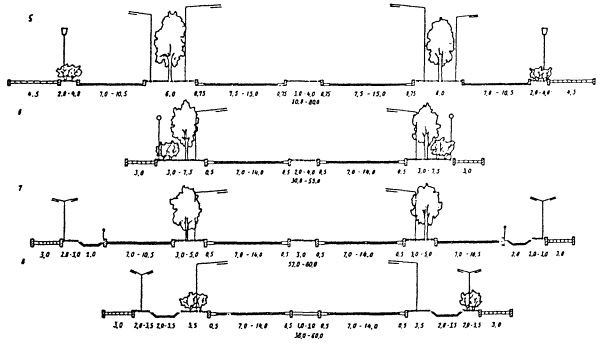 РИС. 2. ТИПОВЫЕ ПОПЕРЕЧНЫЕ ПРОФИЛИ МАГИСТРАЛЬНЫХ УЛИЦ ОБЩЕГОРОДСКОГО ЗНАЧЕНИЯ: 5, 6 - непрерывного движения; 7, 8 - регулируемого движения