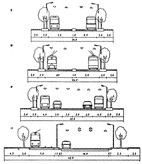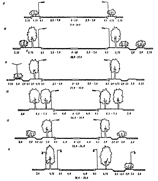 РИС. 3. ТИПОВЫЕ ПОПЕРЕЧНЫЕ ПРОФИЛИ МАГИСТРАЛЬНЫХ УЛИЦ РАЙОННОГО ЗНАЧЕНИЯ: 9, 10, 11 - транспортно-пешеходные; 12, 13, 14 - пешеходно-транспортные