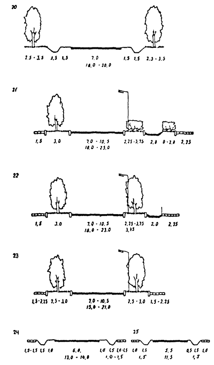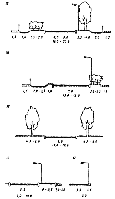 РИС. 4. ТИПОВЫЕ ПОПЕРЕЧНЫЕ ПРОФИЛИ УЛИЦ ДОРОГ МЕСТНОГО ЗНАЧЕНИЯ И ПРОЕЗДОВ: 15 - улицы в жилой застройке; 16 - улицы и дороги научно-производственных, промышленных и коммунально-складских районов; 17 - парковые дороги; 18 - основные проезды; 19 - второстепенные проезды РИС. 5. ТИПОВЫЕ ПОПЕРЕЧНЫЕ ПРОФИЛИ УЛИЦ И ДОРОГ СЕЛЬСКИХ ПОСЕЛЕНИЙ: 20 - поселковая дорога; 21, 22, 23 - главная улица; 24 - основная улица в жилой застройке; 25 - второстепенный (переулок) улица в жилой застройке 4.3. При расчетах интенсивности движения различных транспортных средств их следует приводить к одному расчетному виду (легковой автомобиль), применяя коэффициенты, приведенные в табл. 1. Таблица 2