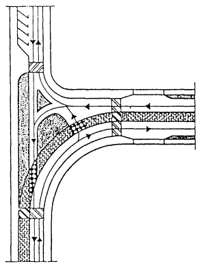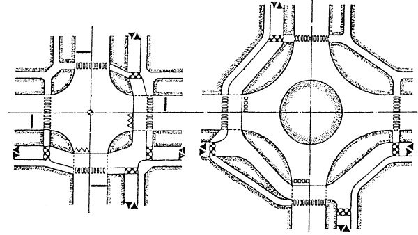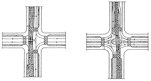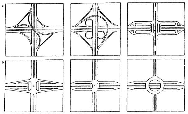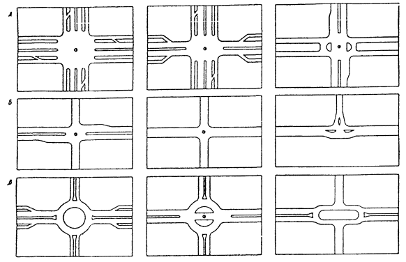 5.4. Дополнительные полосы движения для правых поворотов и зоны накопления для левоповоротных потоков следует устраивать шириной, равной ширине полосы движения данной магистральной улицы и дороги протяженностью, определяемой интенсивностью движения, но не менее 30 м до стоп-линий. Отгоны устраиваются на улицах и дорогах общегородского значения не менее 30 м, на улицах районного значения - не менее 20 м. 5.5. Саморегулируемые кольцевые пересечения следует устраивать при сравнительно одинаковой интенсивности движения на пересекающихся улицах и дорогах в виде площади с центральным островком в форме круга, а при преобладании движения транспорта в одном направлении с центральным островком в форме овала или вытянутого прямоугольника с расчетной длиной участков перестроения, обеспечивающей безопасность движения транспортных средств, но не менее 25 м. РИС. 6. ПЕРЕСЕЧЕНИЕ МАГИСТРАЛЬНЫХ УЛИЦ И ДОРОГ В ОДНОМ УРОВНЕ: А - Пересечения магистральных улиц и дорог общегородского значения; Б - Пересечения магистральных улиц и дорог общегородского и районного значения; В - Кольцевые развязки движения 5.6. Геометрические параметры кольцевых пересечений следует принимать исходя из расчетной скорости и интенсивности движения транспорта на кольце в соответствии с табл. 12. Таблица 12