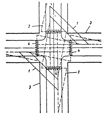 ПРИМЕЧАНИЕ. Наименьший радиус поворота центрального островка следует устанавливать при наличии общественного пассажирского транспорта - 15 м, при его отсутствии - 12 м. 5.7. Ширину кольцевой проезжей части следует принимать исходя из расчетной нагрузки на полосу движения. При интенсивности движения, близкой к пропускной способности одной полосы, следует принимать на кольце две полосы движения. Для удобного и безопасного движения средств общественного транспорта (автобусов) при их интенсивности в сечении более 40 ед./ч следует предусматривать специальную полосу для правого поворота шириной 4 м или пропуск автобусов через центральный островок. Наибольшая ширина кольцевой проезжей части не должна превышать четырех полос движения с учетом уширений на кривой согласно табл. 3. 5.8. Канализование транспортных, велосипедных и пешеходных потоков на пересечениях и примыканиях в одном уровне обеспечивается устройством островков, бортовыми ограждениями, разметкой и дорожными знаками в соответствии с данными Рекомендациями, ГОСТ 23457-86, ГОСТ 13508-74, ГОСТ 10807-78. Направляющие островки, как правило, устраивают треугольной или каплевидной формы и выделяют разметкой или бордюром (при ширине ограничиваемой полосы не менее 2 м) высотой 15 - 25 см. 5.9. На регулируемых и саморегулируемых пересечениях пешеходные переходы, как правило, устраиваются по кратчайшим расстояниям на продолжении тротуаров при условии соблюдения треугольника видимости согласно СНиП 2.07.01-89 и пересечения пешеходами проезжей части за пределами кривой поворота (рис. 7). РИС 7. ПОСТРОЕНИЕ ТРЕУГОЛЬНИКОВ ВИДИМОСТИ: 1 - треугольник видимости «транспорт-транспорт»; 2 - треугольник видимости, «транспорт-пешеход»; 3 - линия застройки; 4 - пешеходный переход В стесненных условиях реконструкции для организации пешеходного движения в зоне перекрестков допускается использовать пространство первых и вторых этажей зданий, ограничивающих расширение улиц до нормативных параметров. Ширину пешеходных переходов следует устанавливать исходя из количества пешеходов, пересекающих улицу за один цикл регулирования при плотности движения 0,5 чел./м2, но не менее 3 м. На пешеходных переходах через проезжую часть улиц и дорог бордюрные ограждения направляющих островков и разделительных полос следует прерывать или устраивать высотой не более 3 - 5 см. Пересечения и примыкания в разных уровнях5.10. Пересечения и примыкания в разных уровнях устраиваются на дорогах скоростного и улицах непрерывного движения, а также на магистральных улицах и дорогах регулируемого движения при суммарной интенсивности транспортных потоков в узле пересечения, превышающей 4000 прив. ед. в час. Допускается устройство пересечений в разных уровнях при меньшей интенсивности движения в случаях, обусловленных рельефом местности или другими градостроительными условиями (рис. 8). На первую очередь строительства допускается устройство отдельных элементов перспективного пересечения с организацией движения транспорта и пешеходов в одном уровне. При этом является обязательным резервирование необходимой территории и осуществление прокладки инженерных коммуникаций с учетом параметров пересечения в разных уровнях. Ширина проезжей части на транспортных сооружениях принимается на основании интенсивности и организации движения тран