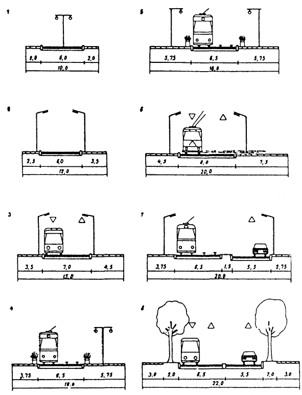 ПРИМЕЧАНИЯ: 1. При промежуточных значениях грузоподъемности транспортных средств коэффициент приведения следует определять интерполяцией. 2. Коэффициенты приведения для автобусов и специальных автомобилей следует принимать как для базовых автомобилей соответствующей грузоподъемности. 3. Коэффициенты приведения грузовых автомобилей и автопоездов при пересеченной и горной местности следует увеличивать в 1,2 раза. Поперечный профиль4.4. Ширину улиц и дорог в красных линиях следует определять путем расчета в зависимости от интенсивности движения транспорта и пешеходов, состава и количества элементов, размещаемых в пределах поперечного профиля, с учетом санитарно-гигиенических условий и требований особых обстоятельств. Как правило, ширина улиц и дорог в красных линиях принимается: магистральных дорог 40 - 75 м; магистральных улиц: в крупных и крупнейших городах 50 - 75 м; в больших, средних и малых городах 30 - 50 м; в поселках и сельских поселениях 20 - 30 м; улиц и дорог местного значения 15 - 25 м. Красные линии обозначают в координатах условную границу между внешними элементами поперечного профиля улиц и дорог (тротуар, обочина, техническая зона и др.) и прилегающей территорией. Многообразие факторов, влияющих на ширину улиц одних и тех же категорий, позволяет рекомендовать только наиболее типичные решения поперечного профиля (см. рис. 1 - 5), которые уточняются для конкретных градостроительных условий. 4.5. При проектировании поперечного профиля состав и количество элементов, их взаиморасположение и пространственное решение определяются особенностями прилегающей застройки, интенсивностью транспортного и пешеходного движения, видами транспорта, использованием надземного и подземного пространства. 4.6. В случаях равноценной застройки и относительно равнозначных по направлениям транспортных потоков поперечный профиль улиц и дорог, как правило, следует проектировать симметричным, а при односторонней жилой или общественной застройке - асимметричным, приближая к застройке линии массового пассажирского транспорта и удаляя автомобильный. На асимметричное решение поперечного профиля улиц и дорог могут повлиять высокая неравномерность автомобильного движения, а также одностороннее расположение основных объектов притяжения населения или автотранспорта. 4.7. На отдельных участках магистральных улиц не рекомендуются размещать более двух видов общественного пассажирского транспорта, при этом основной из них, желательно, устраивать на обособленном полотне по оси проезжей части или с одной из двух сторон улицы. При сравнении вариантов устройства линии общественного пассажирского транспорта на обособленном полотне или в уровне с проезжей частью предпочтение следует отдавать обособленному полотну. Критериями устройства обособленного полотна являются протяженность участка не менее 1000 м (не менее двух перегонов) и интенсивность движения: для трамвая - 20 ед./ч, для автобуса и троллейбуса - 40 ед./ч и более в одном направлении. 4.8. При решении других элементов улиц и дорог рекомендуется: полосы зеленых насаждений помимо разделения различных элементов использовать для устройства защитного озеленения, в целях ограничения распространения пыли, транспортного шума и выхлопных газов автомобилей, размещения шумозащитных стенок, экранов и д