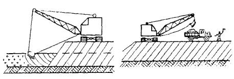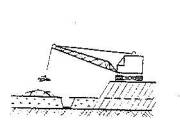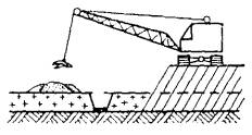 IV. ТЕХНОЛОГИЯ И ОРГАНИЗАЦИЯ ПРОЦЕССА 4.1. При производстве работ по полному выторфовыванию методом поперечных траншей с «головы насыпи» выполняются следующие операции: разработка торфа экскаватором-драглайном на всю толщину залежи и погрузка в транспортные средства; засыпка котлована грунтом, завезенным автосамосвалами, и разравнивание бульдозером грунта насыпи; уплотнение грунта насыпи экскаватором с трамбующей плитой. 4.2. Для обеспечения устойчивости насыпи экскаватор разрабатывает котлован с заглублением в минеральное дно на 0,2 м. При поперечном уклоне дна болота более 1:10 следует выравнивать дно, устраивая с низовой стороны земляного полотна уступы или заглубив подстилающий пласт с низовой стороны.
