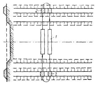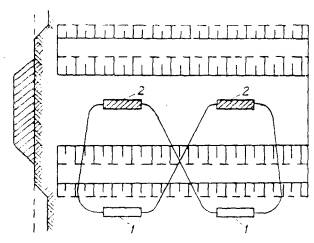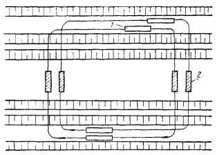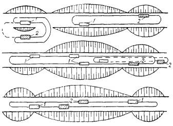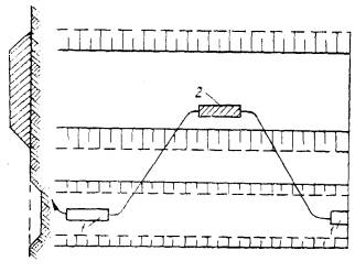 1 - набор грунта; 2 - разгрузка грунта Схема движения по зигзагу применяется при возведении насыпей высотой до 6 м из резервов при длине захватки 200 м и более. При работе скрепера по этой схеме уменьшается число поворотов и дальность транспортировки грунта, вследствие чего производительность скрепера увеличивается на 15 % по сравнению с эллиптической схемой. Челночно-поперечная схема применяется при возведении насыпей высотой менее 1,5 м из двухсторонних резервов. По сравнению с эллиптической схемой движения производительность скрепера выше на 20 - 25 %. 1 - набор грунта; 2 - разгрузка грунта