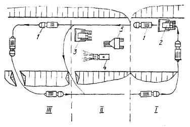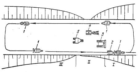 I - зарезание грунта и наполнение ковша; II - разравнивание и уплотнение земляного полотна; III - разгрузка грунта с послойной укладкой его в насыпь; 1 - скреперы; 2 - трактор-толкач; 3 - бульдозер; 4 - поливомоечная машина; 5 - пневмоколесный каток 4.4 График трудового процесса