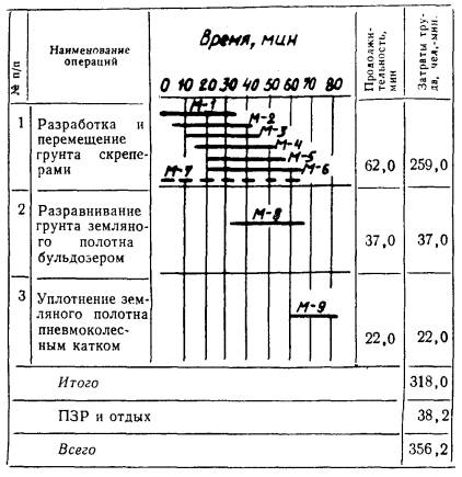 1 - экскаватор; 2 - автомобили-самосвалы; 3 - бульдозер; 4 - поливомоечные машины; 5 - пневмоколесный каток 4.4. График трудового процесса