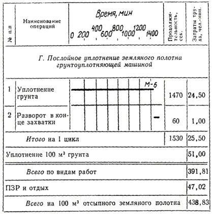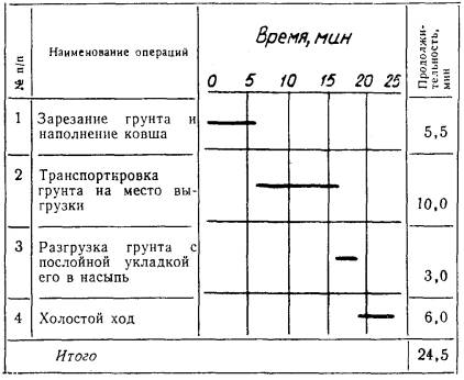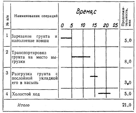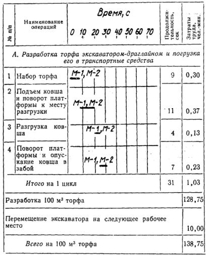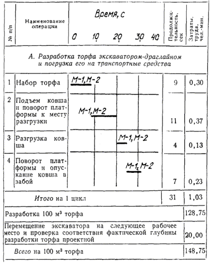 Примечание. Перемещение экскаваторов на следующее рабочее место, перемещение бульдозера с одной захватки на другую, а также проверка соответствия фактической глубины разработки торфа в котловане и траншее проектной выполняются во время технологических перерывов. А. Разработка торфа экскаватором-драглайном и погрузка его в транспортные средства 1. Набор торфа. Выполняют М-1 и М-2 в течение 9 сек. До начала выполнения работ М-1 устанавливает экскаватор на рабочее место (не ближе 0,5 м от края разрабатываемого котлована). М-1 заглубляет ковш в грунт до полного его заполнения. М-2 следит за исправной работой экскаватора и во время технологических перерывов замеряет глубину котлована. 2. Подъем ковша и поворот платформы к месту разгрузки. Выполняют М-1 и М-2 в течение 11 сек. М-1 поднимает ковш с торфом и одновременно поворачивает платформу экскаватора к месту разгрузки ковша. М-2 указывает водителям автомобилей-самосвалов место установки автомобилей и следит за соблюдением правил техники безопасности. 3. Загрузка ковша. Выполняют М-1 и М-2 в течение 4 сек. М-1 выгружает торф из ковша экскаватора в кузов автомобиля-самосвала согласно схеме загрузки. М-2 обеспечивает установку автомобиля у экскаватора на расстоянии, исключающем необходимость тратить время на «прицеливание» и возможность задеть ковшом кабину автомобиля. 4. Поворот платформы и опускание ковша в забой. Выполняют М-1 и М-2 в течение 7 сек. М-1 поворачивает платформу экскаватора и опускает ковш в забой с таким расчетом, чтобы по окончании поворота платформы ковш опускался на грунт. М-2 руководит установкой автомобилей-самосвалов под погрузку, во время технологических перерывов очищает ковш от налипшего торфа. Б. Засыпка котлована грунтом и разравнивание грунта насыпа бульдозером 1. Набор грунта. Выполняет М-3 в течение 8 сек. М-3 заглубляет отвал бульдозера в грунт, высыпанный из кузова автомобиля-самосвала. 2. Перемещение грунта к котловану. Выполняет М-3 в течение 30 сек. М-3 перемещает грунт на второй передаче бульдозера к кромке котлована. 3. Отсыпка грунта в котловане. Выполняет М-3 в течение 9 сек. М-3, постепенно поднимая отвал бульдозера, сталкивает грунт в котлован. 4. Разравнивание грунта насыпи. Выполняет М-3 в течение 18 сек. М-3, возвращаясь к месту набора грунта задним ходом, отвалом бульдозера разравнивает грунт насыпи.
