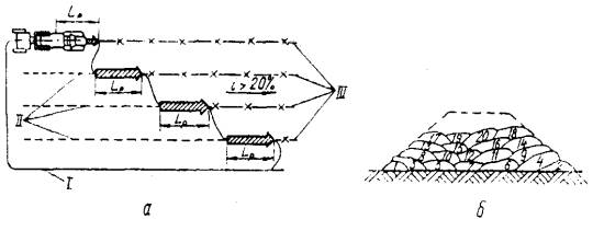 1 - набор грунта; 2 - разгрузка грунта Челночно продольная схема применяется при возведении насыпей высотой до 6 м с заложением откосов не круче 1:2 с транспортировкой грунта из двухсторонних резервов. При работе по этой схеме холостой пробег скрепера сокращается до минимума. 2.16. Для более рационального использования тракторов-толкачей рекомендуется, чтобы каждый скрепер начинал набирать грунт там, где закончил разгрузку предыдущий, а трактор-толкач перемещался назад на такое расстояние, чтобы не препятствовать подходу следующего скрепера. 2.17. Участки насыпи земляного полотна, отсыпаемые скреперами, необходимо разбивать на три - четыре части, на каждой из которых последовательно производить укладку и уплотнение грунта, а при необходимости - разравнивание. 2.18. Грунт необходимо отсыпать по всей площади насыпи земляного полотна ровным слоем, соответственно регулируя проход скреперов по насыпи. 2.19. Разгрузку ковша скрепера следует производить при движении скрепера по прямой. При разгрузке грунта кромка ножа скрепера должна устанавливаться на уровне, обеспечивающем требуемую толщину укладываемого слоя (0,15 - 0,25 м). 2.20. При правильной организации труда по отсыпке грунта в насыпь дополнительного разравнивания его не требуется. 2.21. Каждый слой грунта, отсыпаемый в насыпь, должен быть уплотнен до заданной проектом плотности при оптимальной влажности. 2.22. Толщина слоя уплотняемого грунта при уплотнении его полуприцепными пневмоколесными катками массой 25 - 30 т колеблется в пределах 0,2 - 0,4 м в зависимости от вида грунта. 2.23. Работы следует выполнять в соответствии с требованиями СНиП III-40-78, инструкции по сооружению земляного полотна автомобильных дорог, СНиП III-8-76, «Руководства по производству земляных работ скреперами» (М.: Стройиздат, 1976). 2.24. Необходимо полностью соблюдать «Правила техники безопасности при строительстве, ремонте и содержании автомобильных дорог» (М.: Транспорт, 1969). III. ИСПОЛНИТЕЛИ И ОРУДИЯ ТРУДА 3.1. Состав исполнителей: