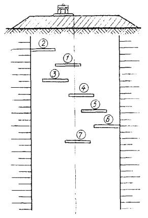 V. ПРИЕМЫ ТРУДА А. Разработка торфа и погрузка его в транспортные средства. 1. Набор торфа. Выполняют М-1 и М-2 в течение 9 сек. До начала работ М-1 устанавливает экскаватор на рабочее место (не ближе 0,5 м от края разрабатываемого котлована). М-1 заглубляет в грунт ковш со сплошной режущей кромкой до полного его заполнения. М-2 следит за исправной работой экскаватора и во время технологических перерывов замеряет глубину котлована. 2. Подъем ковша и поворот платформы к месту разгрузки. Выполняют М-1 и М-2 в течение 11 сек. М-1 поднимает ковш с торфом и одновременно поворачивает платформу экскаватора к месту разгрузки ковша. М-2 указывает водителям автомобилей-самосвалов место установки автомобилей и следит за соблюдением правил техники безопасности. 3. Разгрузка ковша. Выполняют М-1 и М-2 в течение 4 сек. М-1 выгружает торф из ковша экскаватора в кузов автомобиля-самосвала согласно схеме загрузки. М-2 обеспечивает установку автомобиля у экскаватора на расстоянии, исключающем необходимость тратить время на «прицеливание» и возможность задеть ковшом кабину автомобиля. 4. Поворот платформы и опускание ковша в забой. Выполняют М-1 и М-2 в течение 7 сек. М-1 поворачивает платформу экскаватора и опускает ковш в забой с таким расчетом, чтобы по окончании поворота платформы ковш опустился на грунт. М-2 руководит установкой автомобилей-самосвалов под погрузку, во время технологических перерывов очищает ковш от налипшего торфа.