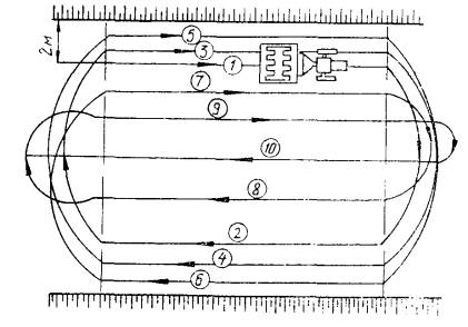 1 - 7 - проходы бульдозера 5.3. Уплотнение земляного полотна пневмоколесным катком. Выполняет М-9 в течение 22 мин. М-9 доуплотняет земляное полотно по кольцевой схеме движения за 4 прохода по одному следу с перекрытием следа на 0,3 - 0,5 м. Уплотнение земляного полотна производится послойно при толщине уплотняемого слоя до 0,4 м. Сухие грунты перед уплотнением необходимо поливать до оптимальной влажности при помощи поливомоечной машины.