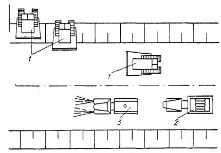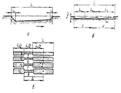 а - обычный; б - гребенчатый; в - ребристо-шахматный; L - длина пути набора; l1 - путь резания; l2 - путь выглубления; hт - глубина резания; L1, L2, L3 - длина пути набора при первом, втором и третьем зарезании грунта; b, с, d - первый, второй, третий ряды проходок; 1 - 12 - проходка скрепера. Стрелкой показано направление движения скреперов 2.12. Разгрузку ковша скрепера следует производить при движении скрепера по прямой. При разгрузке грунта кромка ножа скрепера должна устанавливаться на уровне, обеспечивающем требуемую толщину укладываемого слоя. 2.13. При разработке выемок скрепером в процессе работы происходит грубая планировка и первичное уплотнение земляного полотна. При устройстве выемок плотность грунта в слое от дна корыта до глубины 0,3 м должна удовлетворять требованиям проектного коэффициента уплотнения (0,9 - 1,0). Если плотность грунта в условиях естественного залегания не соответствует этим требованиям, его необходимо разрыхлить на глубину 0,3 м и уплотнить до требуемой плотности. 2.14. Окончательное уплотнение земляного полотна производится пневмоколесными катками ДУ-16В (Д-551В) за 4 прохода по одному следу по кольцевой схеме после полной разработки выемки да проектных отметок. 2.15. Работы следует выполнять в соответствии с требованиями СНиП III-40-78, инструкции по сооружению земляного полотна автомобильных дорог и «Руководства по производству земляных работ скреперами» (М.: Стройиздат, 1976). 2.16. Необходимо полностью соблюдать «Правила техники безопасности при строительстве, ремонте и содержании автомобильных дорог» (М.: Транспорт, 1969). III. ИСПОЛНИТЕЛИ И ОРУДИЯ ТРУДА 3.1. Состав исполнителей: