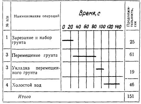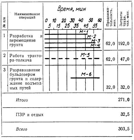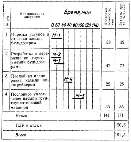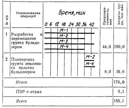 V. ПРИЕМЫ ТРУДА 5.1. Разработка и перемещение грунта бульдозером. Выполняют М-1, М-2, М-3 и М-4 в течение 44 мин. М-1, М-2, М-3 и М-4 начинают по ярусно-траншейной схеме разрабатывать грунт с полос, прилегающих к бровкам выемки. Грунт из выемки в насыпь перемещают по уклону, укладывают послойно. 4.5. График рабочего цикла одного бульдозера.
