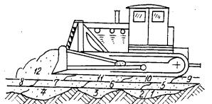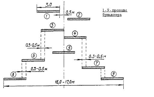 V. ПРИЕМЫ ТРУДА 5.1. Разработка и перемещение грунта бульдозером. Выполняют М-1, М-2 и М-3 в течение 54 мин. М-1, М-2 и М-3 заглубляют отвал на максимальную глубину и уменьшают это заглубление по мере образования перед отвалом необходимого количества грунта. Перемещают разработанный грунт на второй и третьей передаче трактора по ступенчатой схеме. Двигаясь по прямой вперед, срезают и перемещают грунт в насыпь. После окончания операции М-1, М-2 и М-3 возвращаются для следующего набора грунта. Для набора следующей партии грунта бульдозер возвращается задним ходом. На месте укладки М-1, М-2 и М-3 поднимают отвал на высоту 0,15 - 0,2 м и укладывают грунт ровным слоем. При этом уложенный грунт предварительно уплотняется гусеницами.