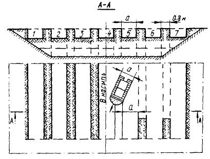 IV. ТЕХНОЛОГИЯ И ОРГАНИЗАЦИЯ ПРОЦЕССА 4.1. При производстве работ по частичному выторфовыванию на болотах I и II типов методом поперечных траншей «с головы насыпи» выполняются следующие операции: разработка торфа экскаватором-драглайном на проектную глубину и погрузка его в транспортные средства; засыпка котлована грунтом, завезенным автомобилями-самосвалами, и разравнивание бульдозером грунта насыпи; устройство водопонижающих траншей экскаватором-грейфером с отсыпкой торфа в боковые продольные отвалы; уплотнение грунта насыпи грунтоуплотняющей машиной. 4.2. При наличии карьера с грунтом, применяемым для отсыпки земляного полотна, в непосредственной близости от места складирования торфа применяется круговая схема работы автотранспорта. После выгрузки грунта автомобили-самосвалы устанавливаются на место погрузки торфа под углом 15 - 25° к оси прохода экскаватора. Загрузка грунтом производится экскаватором по схемам, позволяющим наиболее рационально использовать объем кузова автомобиля-самосвала, оборудованного нарощенными бортами для перевозки торфа: ЗИЛ-ММЗ-555 и МАЗ-503Б на 30 см, КрАЗ-256 - на 10 см. 4.3. Уплотнение грунта земляного полотна грунтоуплотняющей машиной производится после разравнивания грунта бульдозером на расстояние, обеспечивающее безопасную работу автотранспорта, бульдозера и экскаватора. 4.4. Водопонижающие канавы разрабатываются параллельно оси дороги на расстояние, обеспечивающее дальнейшее возведение насыпи, и служат для отвода поверхностных вод и понижения уровня грунтовых вод во время эксплуатации дороги. Торф из водопонижающих траншей складируется в боковые продольные валики, расположенные на расстоянии максимального радиуса вылета стрелы экскаватора. Расстояние от края траншеи до кавальера не должно быть меньшим глубины болота. Глубина канавы составляет от 1 до 2,5 м. 4.5. Схема организации рабочего места.