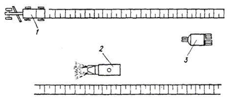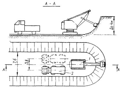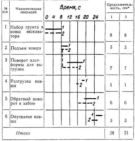 * 1 - работа экскаватора без совмещения операций; 2 - то же, при совмещении операций. V. ПРИЕМЫ ТРУДА 5.1. Разработка и погрузка грунта экскаватором. Выполняют М-1 и М-2 в течение 69 мин. Водитель размещает автомобиль-самосвал вдоль одного из откосов выемки. М-1 набирает в ковш грунт и, поворачивая стрелу под углом до 90°, производит разгрузку ковша. Набор грунта в ковш М-1 начинает с наиболее близкой к самосвалу точки, а разгрузку - с наиболее отдаленной точки кузова. М-2 следит за техническим состоянием экскаватора, состоянием забоя и во время технологических перерывов устраняет мелкие неисправности экскаватора и очищает ковш от налипшего грунта.