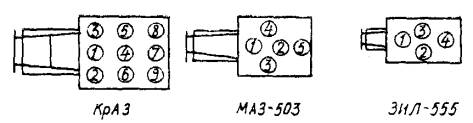 4.3. При наличии карьера с грунтом, применяемым для отсыпки земляного полотна, в непосредственной близости от места складирования торфа применяется круговая схема работы автотранспорта. После выгрузки грунта автосамосвалы устанавливаются на место погрузки торфа под углом 15 - 25° к оси прохода экскаватора. Загрузка грунтом производится по схемам, позволяющим наиболее рационально использовать объем кузова автомобиля-самосвала, оборудованного нарощенными бортами для перевозки торфа: ЗИЛ-ММЗ-555 и МАЗ-503Б на 30 см, КрАЗ-256 - на 10 см. 4.4. Схема загрузки автомобилей-самосвалов