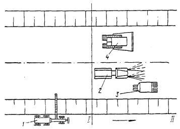 I - разработка и перемещение грунта в насыпь; II - разравнивание и уплотнение грунта; 1 - грейдер-элеватор; 2 - поливомоечная машина; 3 - пневмоколесный каток; 4 - бульдозер 4.4. График трудового процесса.