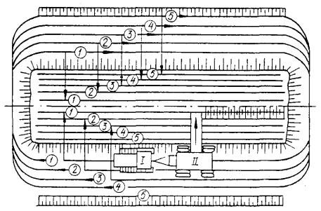 1 - набор грунта; 2 - разгрузка грунта Схема движения по «восьмерке» применима при тех же условиях, что и эллиптическая. При движении по этой схеме левые и правые повороты чередуются, что вдвое сокращает время на повороты. Производительность скрепера увеличивается на 3 - 5 % по сравнению с движением по эллиптической схеме. 1 - набор грунта; 2 - разгрузка грунта