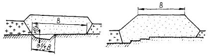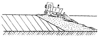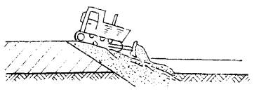 2.9. При возведении насыпей (первый проход автогрейдера) пробивка производится по отметкам, установленным при разбивке дороги, в последующем (после специальной разбивки) - по колышкам или по движущейся вешке. 2.10. В зависимости от высоты сооружаемых насыпей рекомендуется два способа перемещения и укладки грунта: вполуприжим, или вразбежку, и вприжим.