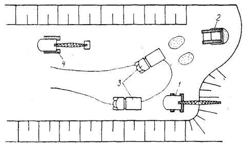 IV. ТЕХНОЛОГИЯ И ОРГАНИЗАЦИЯ ПРОЦЕССА 4.1. При устройстве земляного полотна в выемке выполняются следующие операции: разработка выемки скрепером (зарезание грунта и наполнение ковша, транспортировка грунта на место выгрузки с частичным его уплотнением, разгрузка ковша с послойной укладкой грунта в места отсыпки, холостой ход), профилирование земляного полотна бульдозером, укатка земляного полотна. 4.2. Работы рекомендуется выполнять механизированным отрядом, в составе которого: четыре скрепера ДЗ-11 (Д-357М), бульдозер ДЗ-8 (Д-271), пневмоколесный каток ДУ-16В, (Д-551В), поливомоечная машина ПМ-130, трактор-толкач Т-100. 4.3. Схема организации рабочего места.