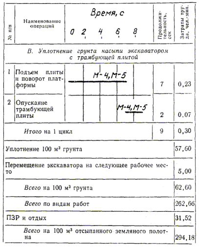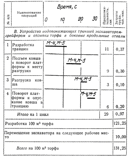В. Устройство водопонижающих траншей экскаватором-грейфером и отсыпка торфа в боковые продольные отвалы 1. Разработка траншеи. Выполняют М-4 и М-5 в течение 11 сек. До начала работ М-4 устанавливает экскаватор на рабочее место (не ближе 0,5 м от края насыпи). М-4 набирает ковшом грунт в траншее до полного его заполнения. М-5 следит за исправной работой экскаватора, во время технологических перерывов замеряет глубину траншеи. 2. Подъем ковша и поворот платформы к месту разгрузки. Выполняют М-4 и М-5 в течение 9 сек. М-4 поднимает ковш с торфом и одновременно поворачивает платформу экскаватора к месту разгрузки ковша. М-5 руководит работой автомобилей-самосвалов по завозу грунта и следит за соблюдением правил техники безопасности. 3. Разгрузка ковша. Выполняют М-4 и М-5 в течение 3 сек. М-4 выгружает торф из ковша экскаватора в боковой продольный отвал на расстоянии максимального радиуса вылета стрелы экскаватора. М-5 руководит работой автомобилей-самосвалов по завозу грунта и следит за соблюдением правил техники безопасности. 4. Поворот платформы и опускание ковша в траншею. Выполняют М-4 и М-5 в течение 6 сек. М-4 поворачивает платформу экскаватора и опускает ковш в траншею с таким расчетом, чтобы по окончании поворота платформы ковш опустился на грунт. М-5 выполняет работы в соответствии с указаниями М-4, во время технологических перерывов очищает ковш от налипшего торфа.