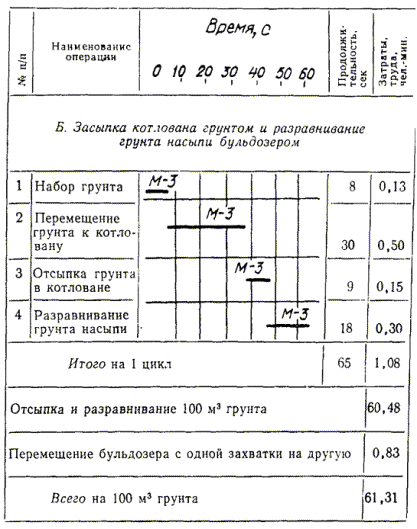 Б. Засыпка котлована грунтом и разравнивание грунта насыпи бульдозером 1. Набор грунта. Выполняет М-3 в течение 8 сек. М-3 заглубляет отвал бульдозера в грунт, высыпанный из кузова автомобиля-самосвала. 2. Перемещение грунта к котловану. Выполняет М-3 в течение 30 сек. М-3 перемещает грунт на второй передаче бульдозера к кромке котлована. 3. Отсыпка грунта в котловане. Выполняет М-3 в течение 9 сек. М-3, постепенно поднимая отвал бульдозера, сталкивает грунт в котлован. 4. Разравнивание грунта насыпи. Выполняет М-3 в течение 18 сек. М-3, возвращаясь к месту набора грунта задним ходом, отвалом бульдозера разравнивает грунт насыпи.