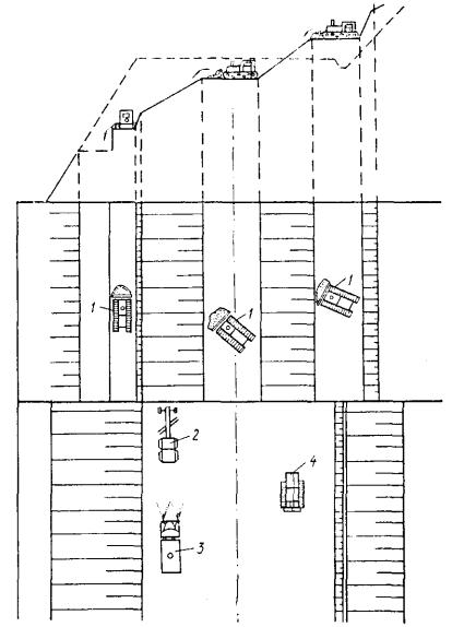 IV. ТЕХНОЛОГИЯ И ОРГАНИЗАЦИЯ ПРОЦЕССА 4.1. При производстве работ по устройству земляного полотна типа полунасыпь - полувыемка на косогоре крутизной до 30° бульдозерами выполняются следующие операции: нарезка уступов и отсыпка насыпи; разработка и перемещение грунта выемки; послойная планировка насыпи автогрейдером; послойное уплотнение насыпи грунтоуплотняющей машиной. 4.2. Разработка косогора универсальным бульдозером (с поворотным отвалом) ведется продольно-диагональными проходами вдоль косогора с ранее устроенного уступа. Работа ведется только частью отвала, обращенного к косогору. Угол резания устанавливается для рыхлых грунтов - 55 - 60, для более плотных - 45 - 50°. 4.3. Для обеспечения устойчивости земляного полотна с низовой стороны насыпи продольными проходами бульдозера нарезают уступы высотой до 2 м. Поперечные уклоны уступов, направленные в низовую сторону, равны 0,01 - 0,02. Стенки уступов высотою до 1 м выполняются вертикальными, а большей высоты-с откосами крутизной 1:0,5. Ширина полки принимается от 1 до 4 м. Грунт с каждого последующего уступа используется для возведения тела насыпи, опирающейся на предыдущий уступ. 4.4. Отсыпка последующих слоев насыпи производится после разравнивания и уплотнения нижележащих слоев. 4.5. Расход воды составляет 10 % половины объема поливаемого грунта. 4.6. Схема организации рабочего места.
