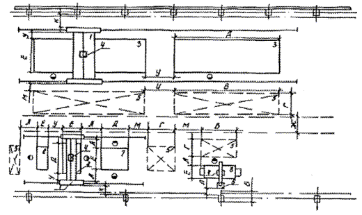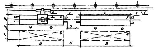 Рис. 2. Размещение установки велосипедной тележки для автоматической сварки продольных и кольцевых швов цилиндрических изделий: 1 - направляющий рельс; 2 - велосипедная тележка с балконом; 3 - сварочный автомат; 4 - стенд роликовый механизированный; 5 - сварная сборочная единица; 6 - место складирования. Таблица 14
