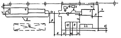 Рис. 4. Размещение оборудования для электронно-лучевой сварки: 1 - установка электронно-лучевой сварки; 2 - установка для размагничивания; 3 - пресс для запрессовки; 4 - моечно-сушильный агрегат; 5 - подвесной грузонесущий конвейер; 6 - монорельс; 7 - ограждающие элементы помещения для электронно-лучевой сварки; 8 - места складирования; 9, 10, 11 - шкафы управления и источники питания. Примечание. Размеры уточняются по паспортным данным оборудования. Таблица 16