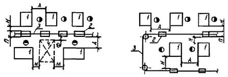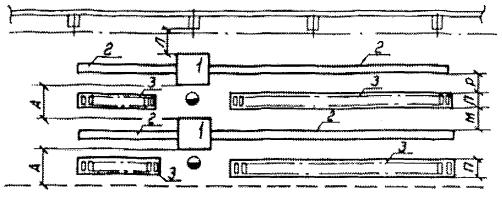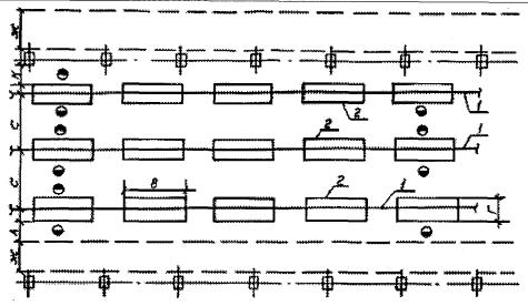 Рис. 9. Размещение напольных конвейеров: 1 - напольный конвейер; 2 - стол, оборудование. Таблица 21