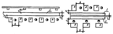 Рис. 11. Размещение конвейеров сборки, рихтовки и отделки изделий: 1 - конвейер; 2 - обрабатываемое изделие. В нормах указаны расстояния от габаритов оборудования, включающих крайние положения движущихся частей его, оснастку, элементы механизации, питания и управления, габариты обрабатываемых деталей и сварных сборочных единиц с учетом их установки и снятия до смежного оборудования или элементов здания. Нормы расстояний (табл. 12 - 22) между рядом стоящим оборудованием не распространяются на гибкие производственные системы, роботизированные и комплексно-автоматизированные участки. Эти расстояния определяются планом расположения оборудования конкретных участков, с учетом конструкции оборудования, транспортно-складских систем, систем управления и условий обслуживания. Нормы расстояний предусматривают возможность монтажа и демонтажа отдельных узлов при ремонте оборудования. Электрошкафы, пульты управления и т.п., расположение которых определено заводом-изготовителем оборудования, включаются в габариты оборудования. Расстояние между электрошкафами, пультами управления, не входящими в габариты оборудования, элементами здания или смежного оборудования следует принимать в соответствии с требованиями правил по установке и эксплуатации электрооборудования. При установке оборудования на индивидуальные фундаменты расстояние от колонн и смежного оборудования принимать с учетом конфигурации и глубины залегания фундаментов оборудования и колонн здания. При обслуживании оборудования мостовыми и подвесными кранами максимальное приближение этого оборудования к стенам и колоннам зданий должно определяться с учетом крайних положений крюка крана. Уменьшение расстояний между оборудованием, оборудованием и строительными конструкциями, приведенных в настоящих нормах, не допускается. 7. СПЕЦИАЛЬНЫЕ ТРЕБОВАНИЯ К РАЗРАБОТКЕ РАЗДЕЛОВ ПРОЕКТА «СТРОИТЕЛЬНЫЕ РЕШЕНИЯ» И «ОХРАНА ОКРУЖАЮЩЕЙ СРЕДЫ»При проектировании сборочно-сварочных цехов следует учитывать специальные требования, обусловленные особенностями технологического процесса изготовления сварных сборочных единиц и требования действующих норм, инструкций и правил проектирования, относящихся к вопросам техники безопасности, производственной санитарии, охране труда, окружающей природной среды и пожарной безопасности. 7.1. Требования к помещениям Организация рабочих мест и труда должна обеспечивать выполнение эргономических требований к рабочим местам в соответствии с требованиями ГОСТ 12.2.049-80, ГОСТ 12.2.032-78, ГОСТ 12.2.033-78, «Санитарных правил при сварке, наплавке и резке металлов» и «Гигиенической классификации труда» № 4137-86 Минздрава. Рабочие места сварщиков следует ограждать экранами из несгораемых материалов согласно требованиям «Правил пожарной безопасности в Российской Федерации» ППБ 01-93. Для мелких изделий стационарные рабочие моста сварщиков следует оборудовать в кабинах с открытым верхом. При сварке в среде защитных газов обшивка кабины не должна доходить до пола на 300 мм, а высота светозащитного экрана должна быть не менее 2 м. Обшивка кабин и светозащитного экрана должна выполняться из несгораемых материалов. Площадь кабины сварщика должна быть не менее 4,5 м и быть достаточной для размещения сварочного оборудования, сварной сборочной единицы, приспосо